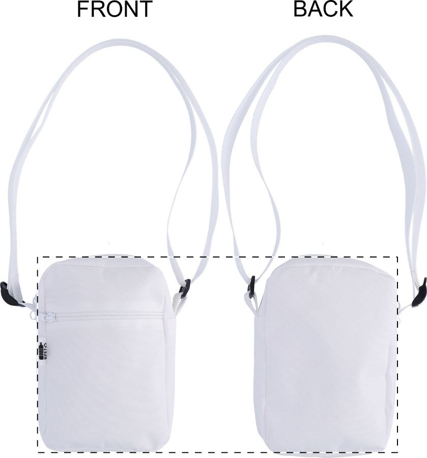 Vertikální crossbody kabelka vyrobená na zakázku z 600D RPET polyesteru s přihrádkou na zip a přední kapsou. S celoplošně tištěnou sublimační grafikou a výrazným štítkem RPET. MOQ: 25 ks.