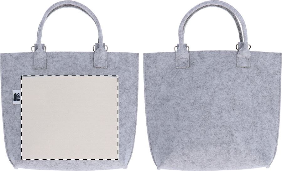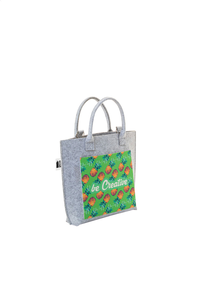 Na zakázku vyrobená dámská crossbody kabelka z RPET plsti s celobarevně potištěnou přední kapsou. S krátkými držadly, odnímatelným ramenním popruhem a výrazným štítkem RPET. Cena včetně sublimačního tisku, nezahrnuje tiskovou přípravu. Min. mn.: 25 ks.