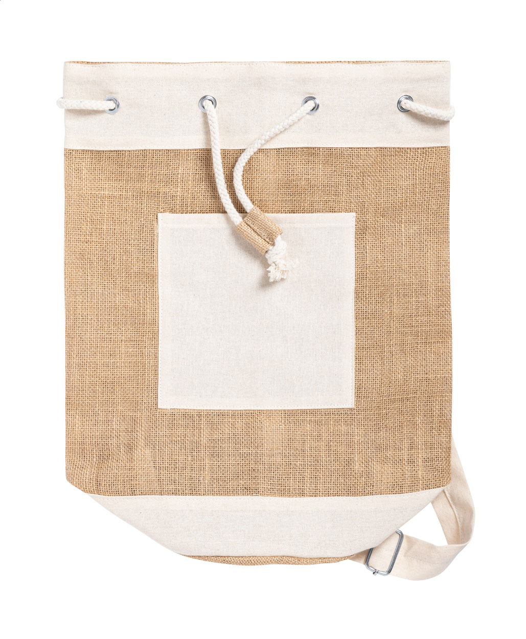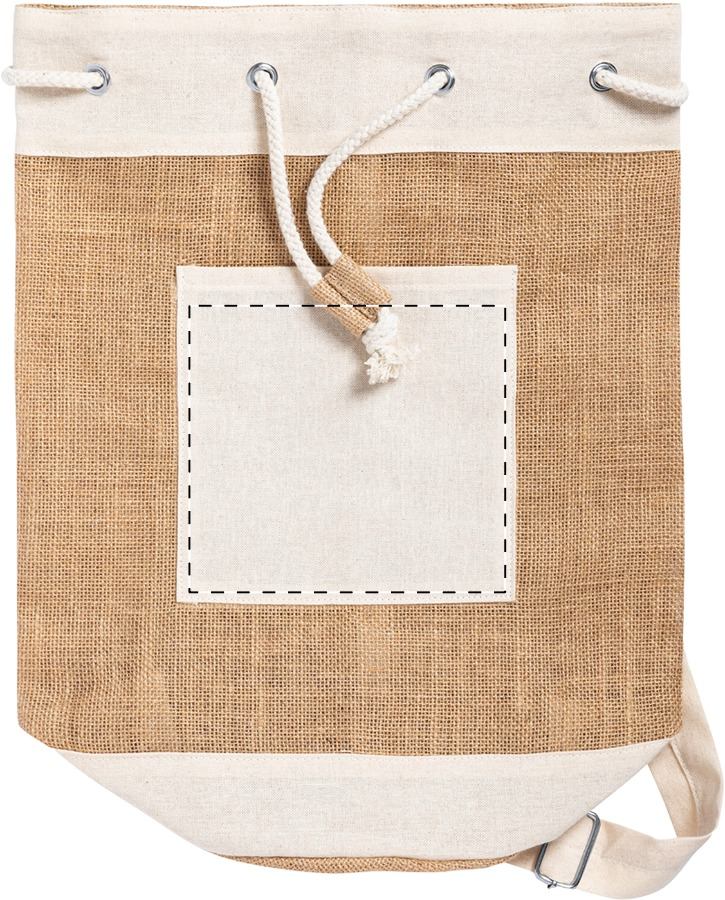 Jutový námořnický vak se stahováním šňůrkou a bavlněnou přední kapsou.