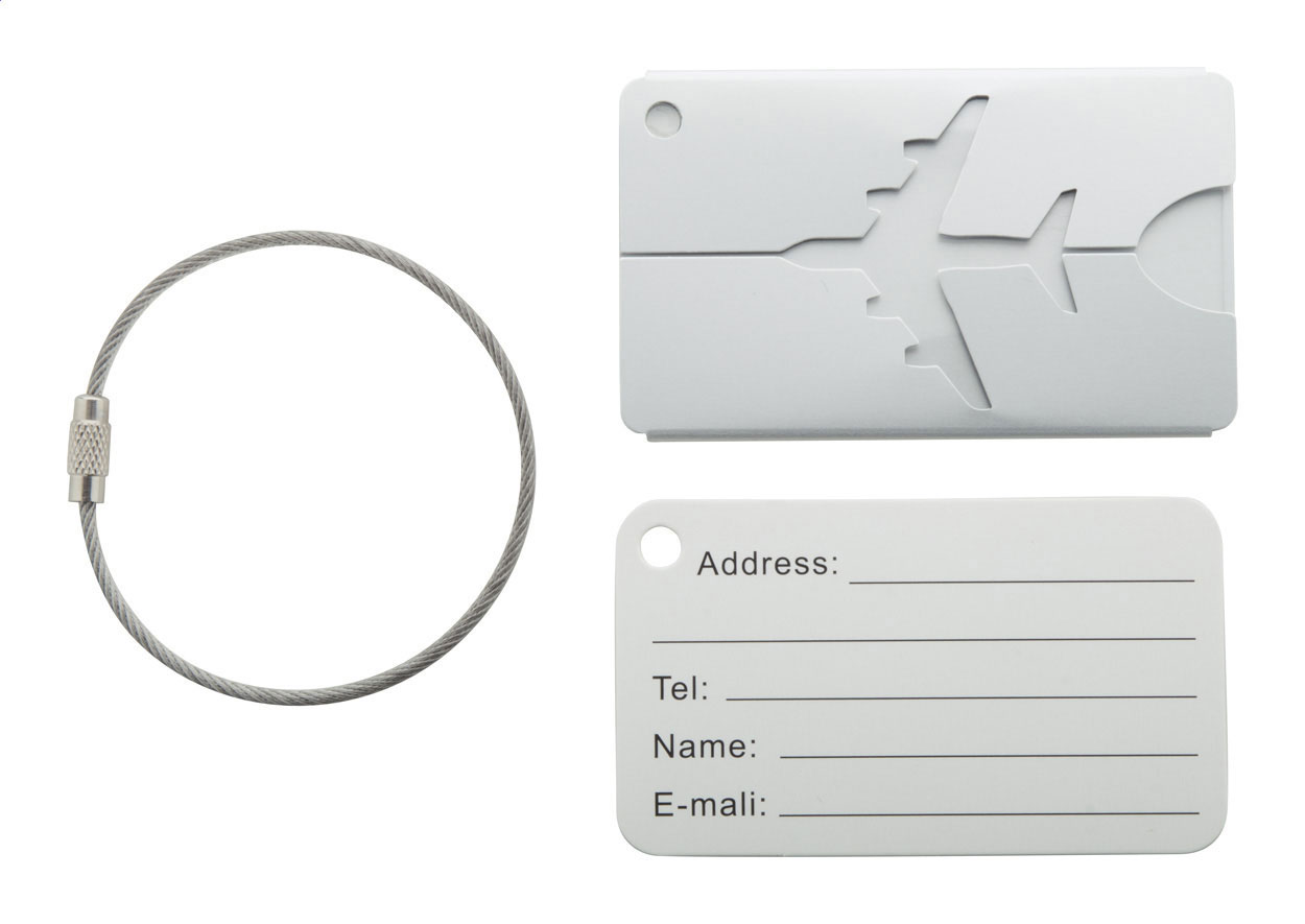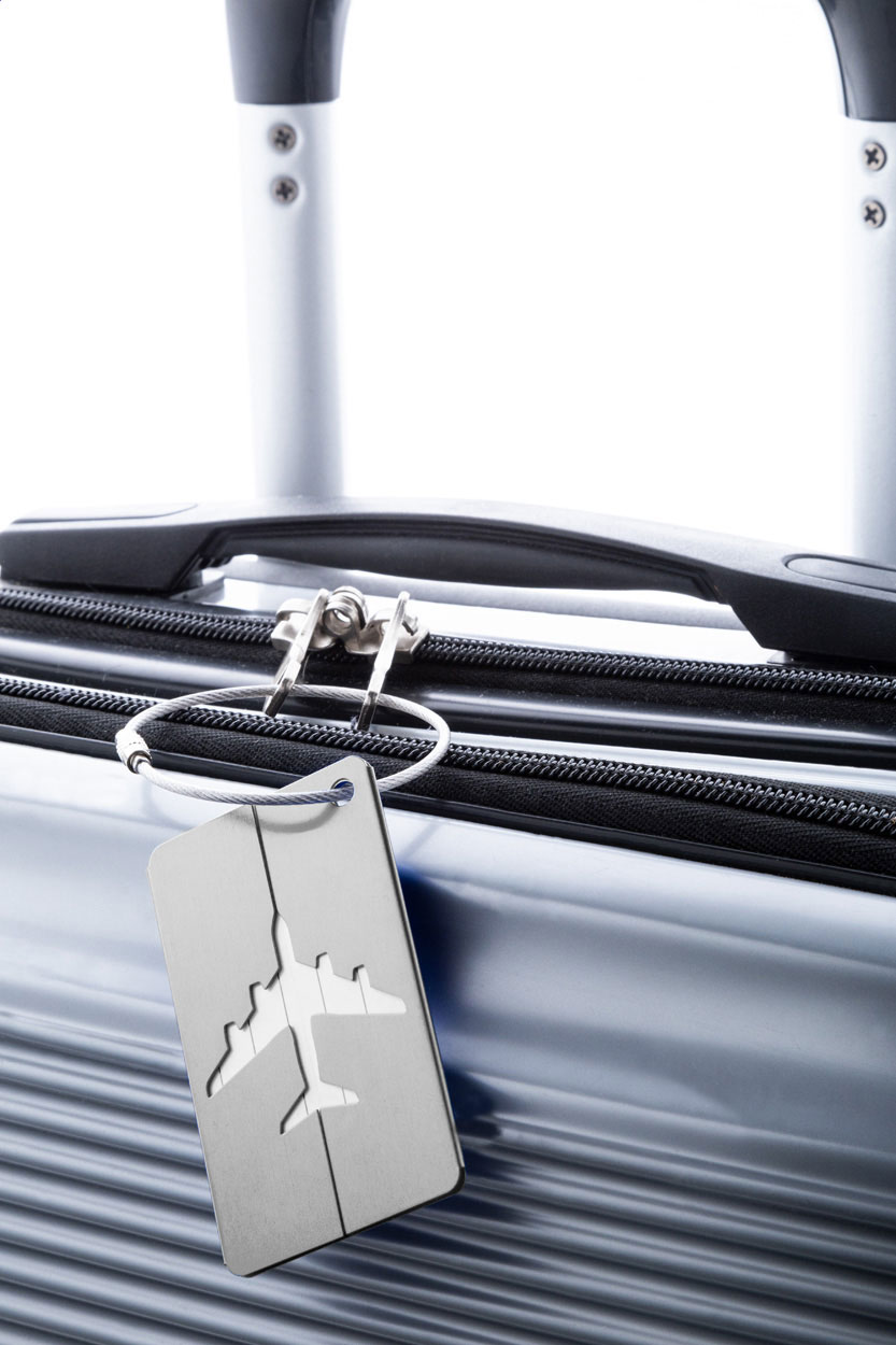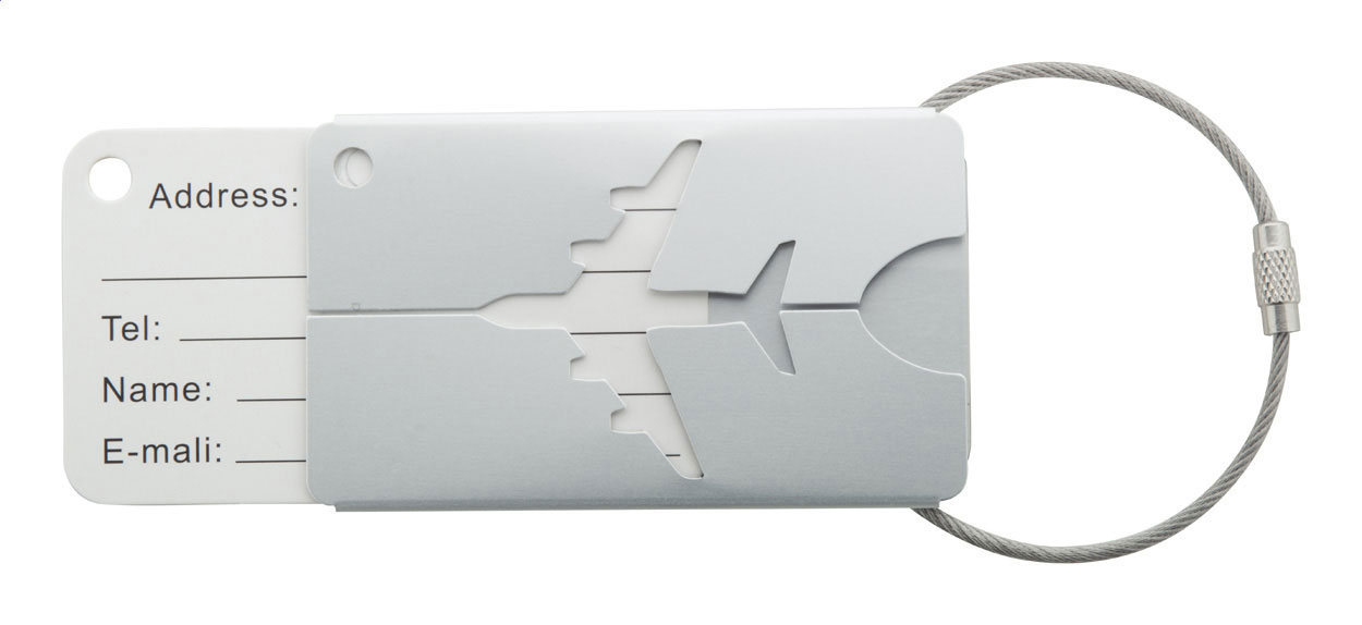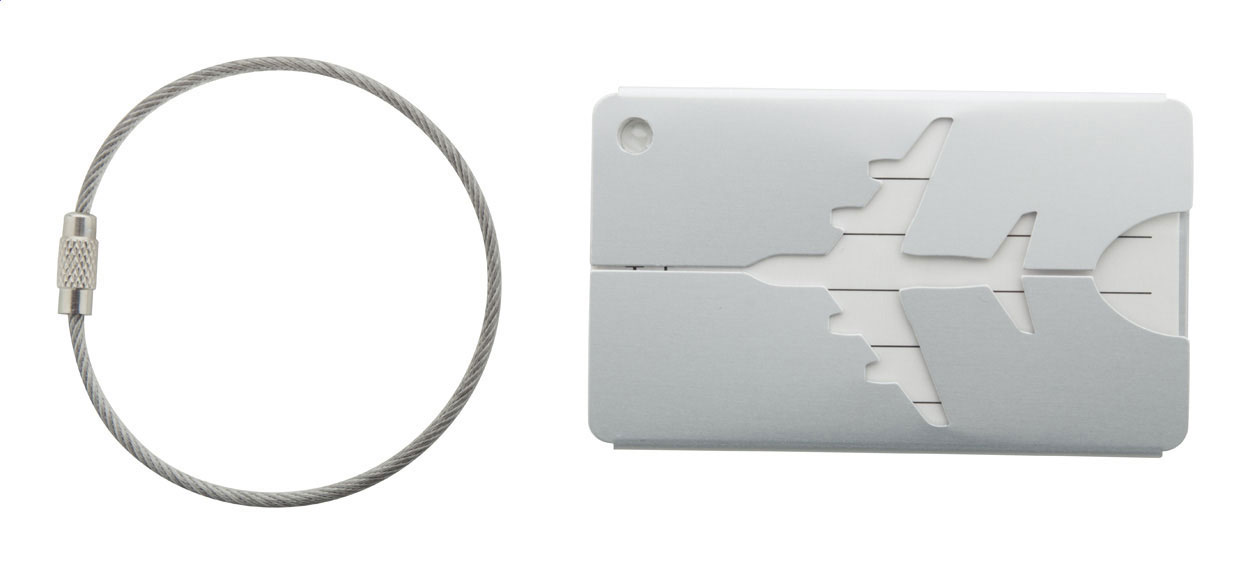 Hliníková visačka na zavazadla s motivem letadla a kovovým lankem.