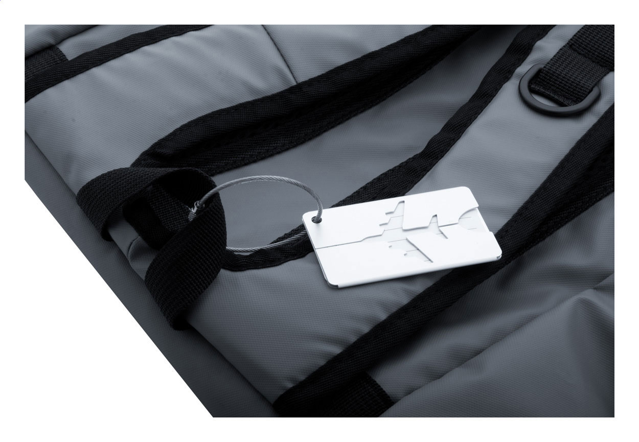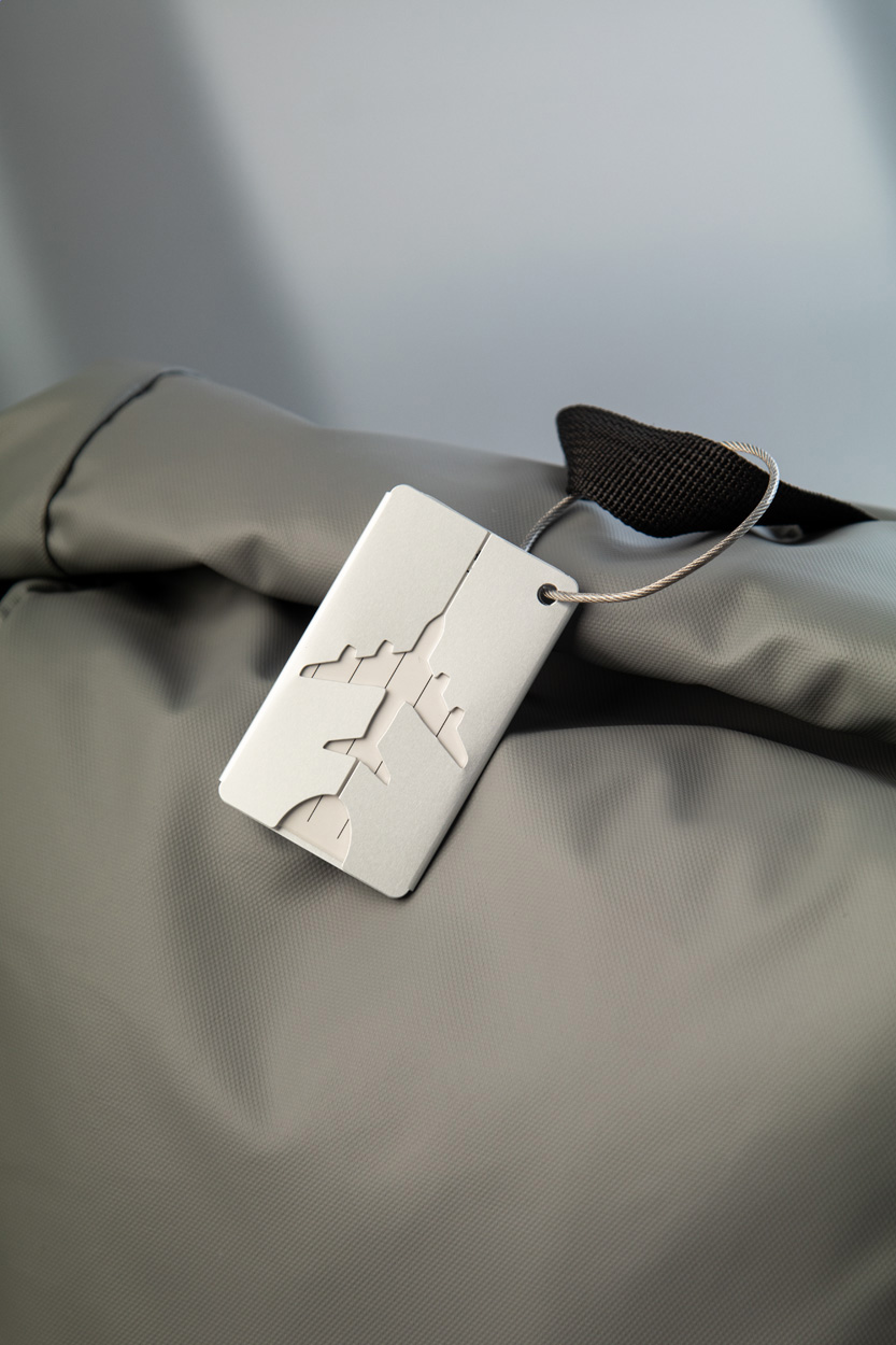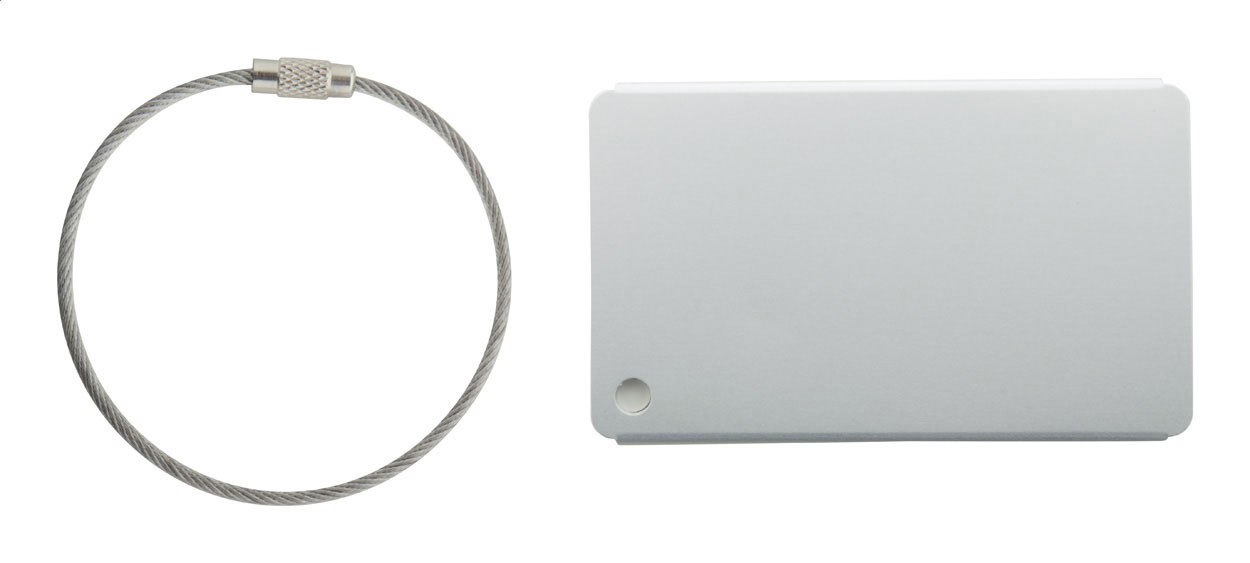 Hliníková visačka na zavazadla s motivem letadla a kovovým lankem.