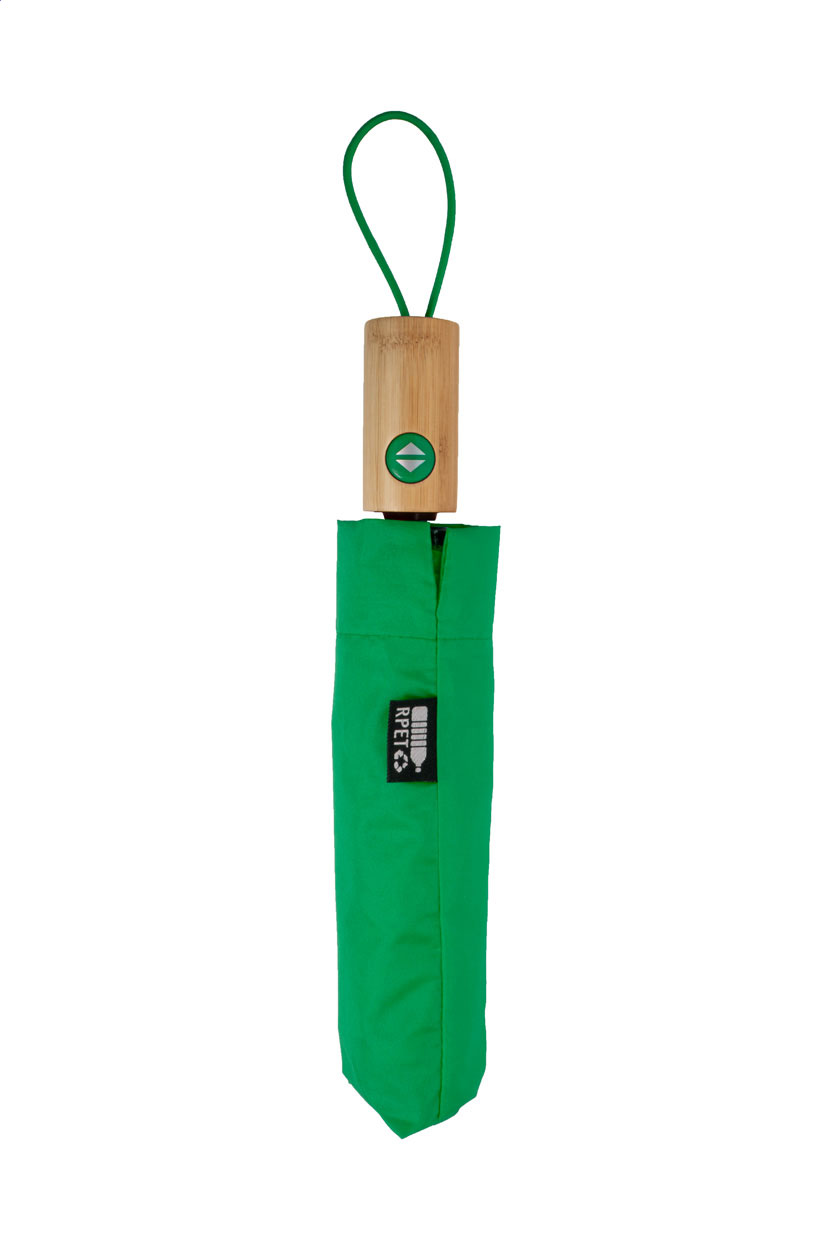 Plně automatický (otevřít/zavřít), větruodolný skládací deštník s 8 panely v pouzdře v odpovídající barvě. S kovovým rámem, sklolaminátovými žebry a bambusovou rukojetí. Pongee 190T RPET. S výrazným štítkem RPET.