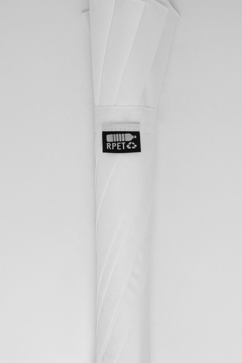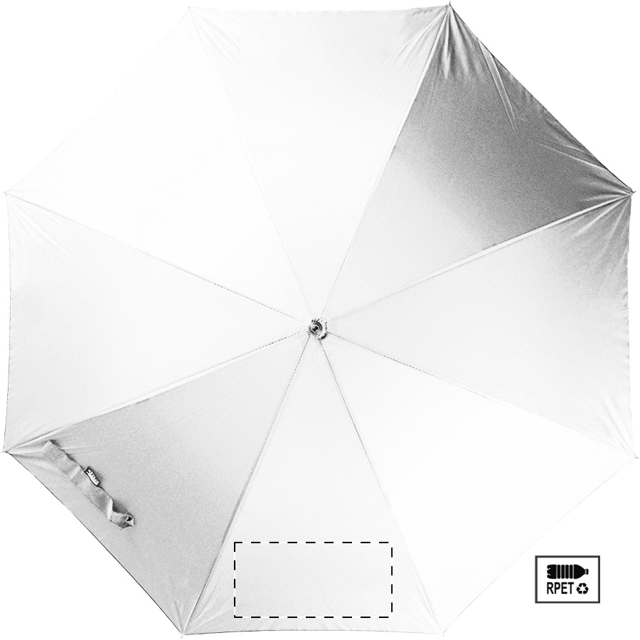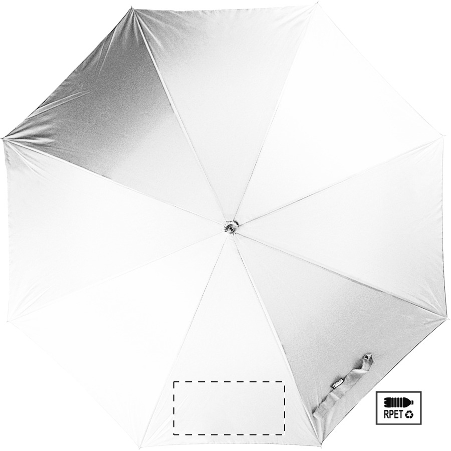 Automatický větruodolný deštník s 8 panely, sklolaminátovým rámem, kovovou tyčí a zakřivenou ABS rukojetí. Pongee 190T RPET. S výrazným štítkem RPET.