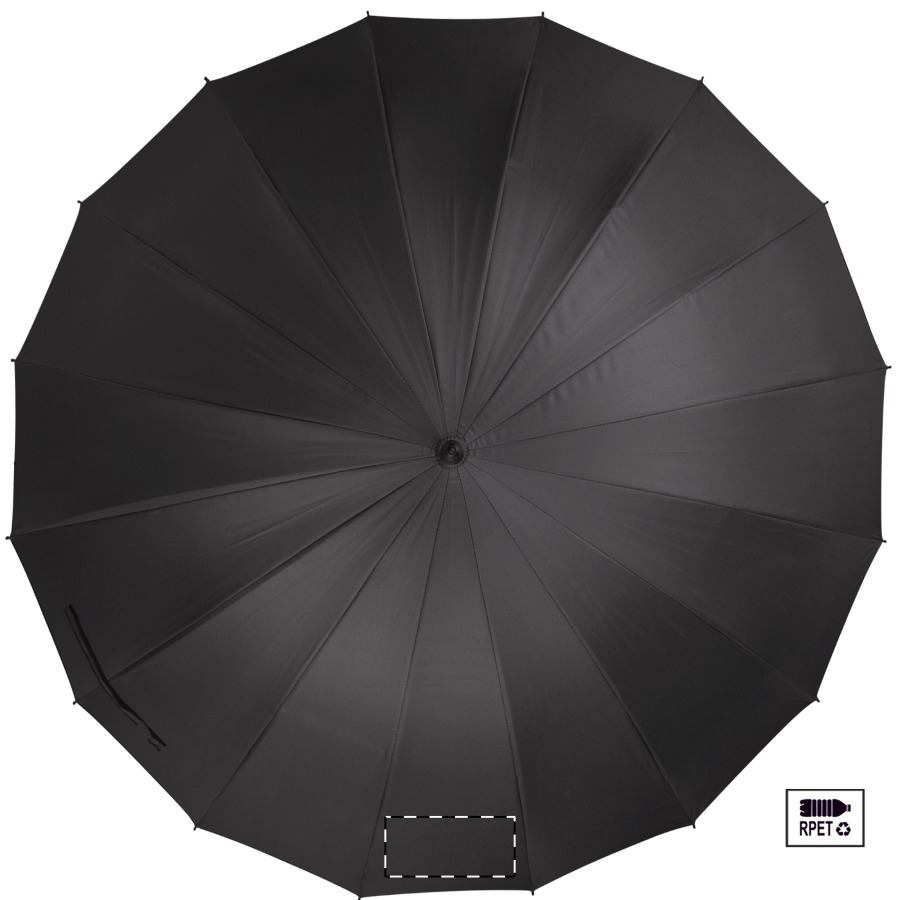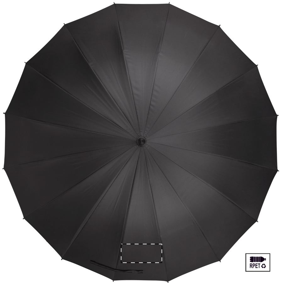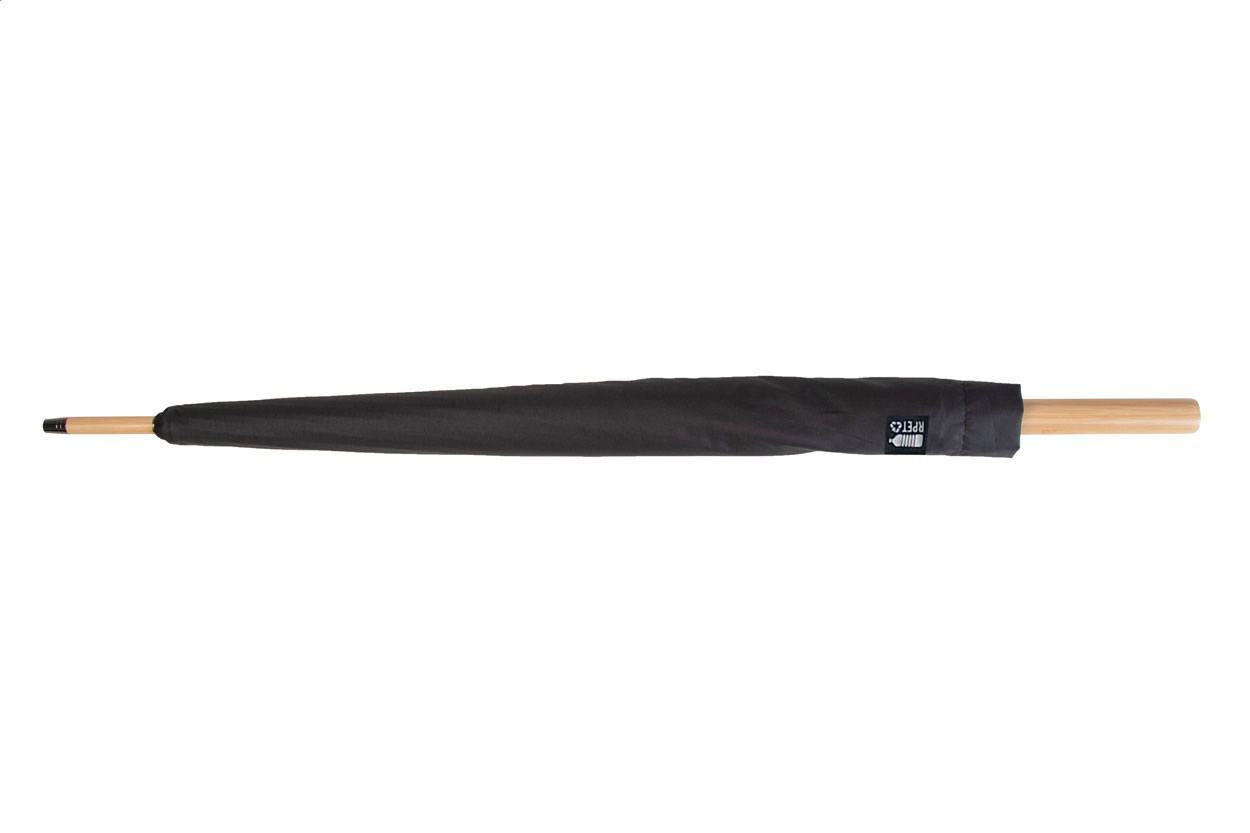 Manuální, větruodolný deštník s 16 panely, bambusovou rukojetí a držadlem, sklolaminátovým rámem a žebry. V barevném pouzdře. Pongee 190T RPET. S výrazným štítkem RPET.