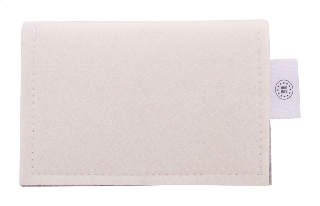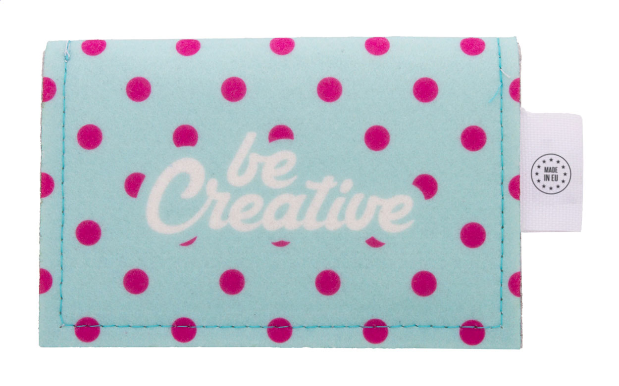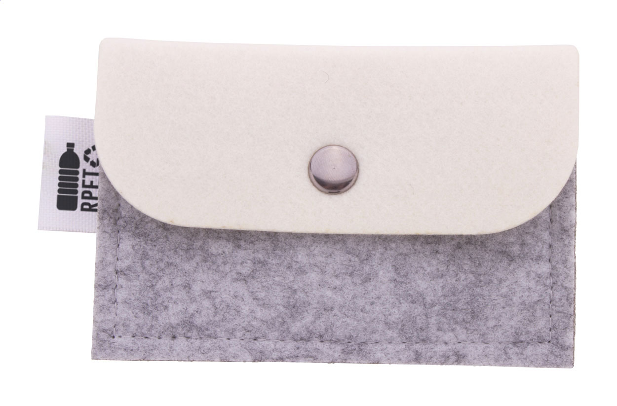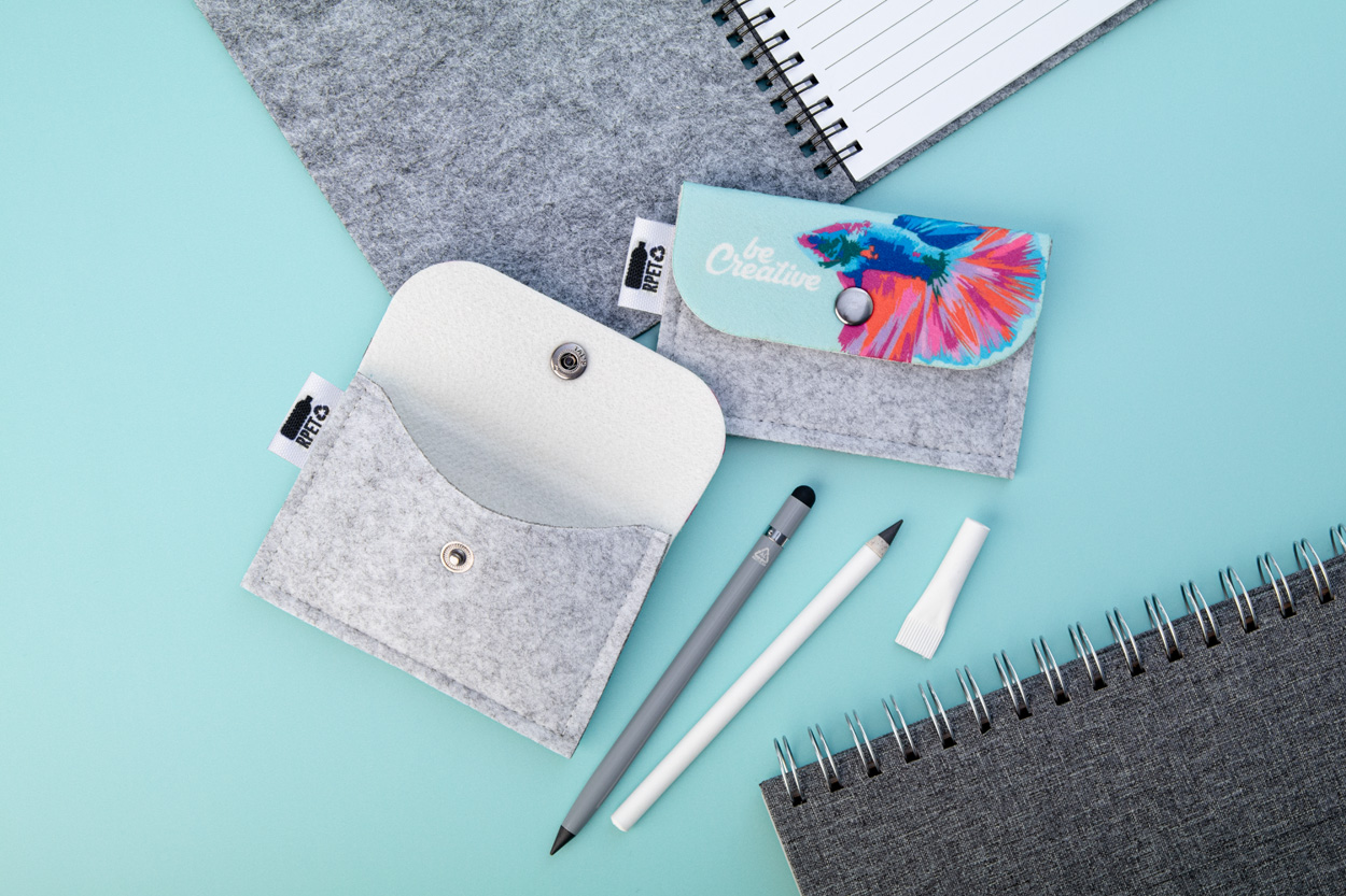 Peněženka z RPET plsti na zakázku s plnobarevně potištěnou klopou a zadní stranou. S výrazným štítkem RPET. Cena včetně sublimačního tisku, nezahrnuje tiskovou přípravu. Min. mn.: 50 ks.