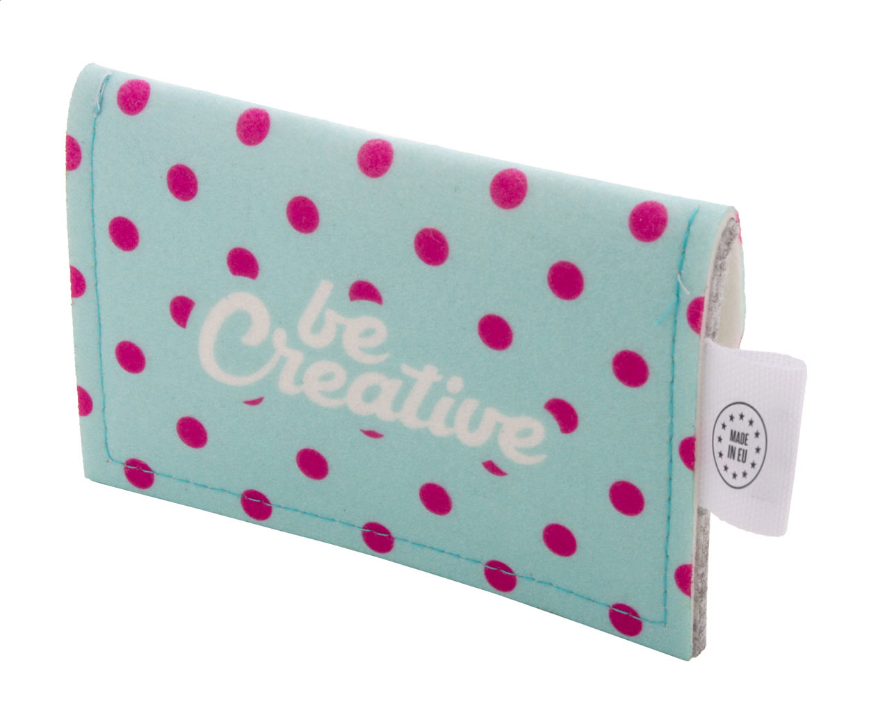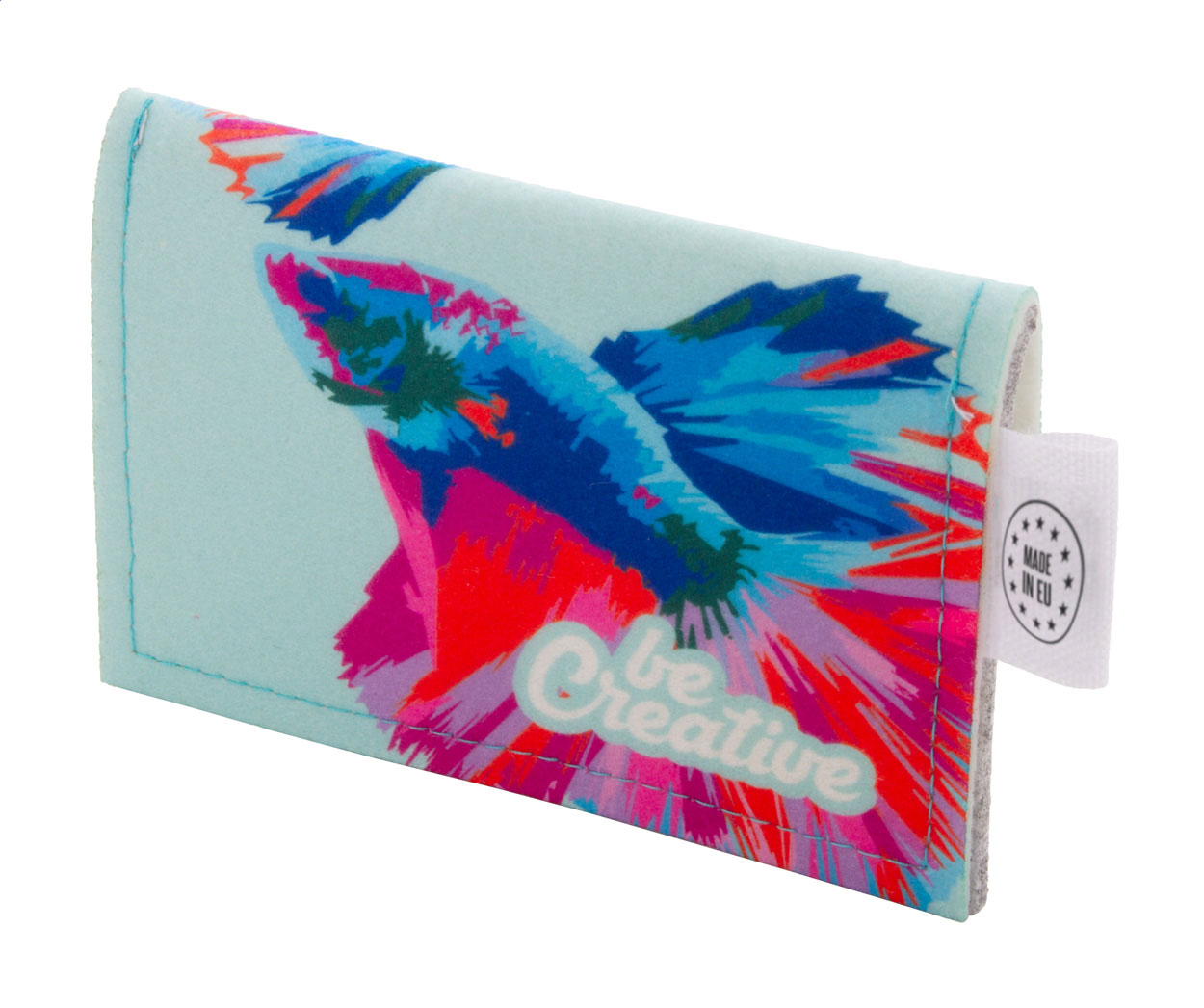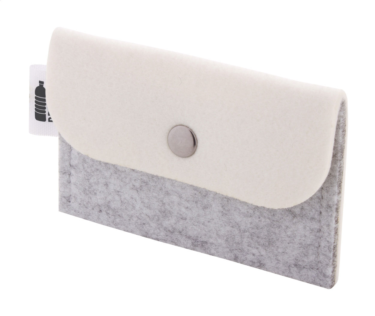 Peněženka z RPET plsti na zakázku s plnobarevně potištěnou klopou a zadní stranou. S výrazným štítkem RPET. Cena včetně sublimačního tisku, nezahrnuje tiskovou přípravu. Min. mn.: 50 ks.
