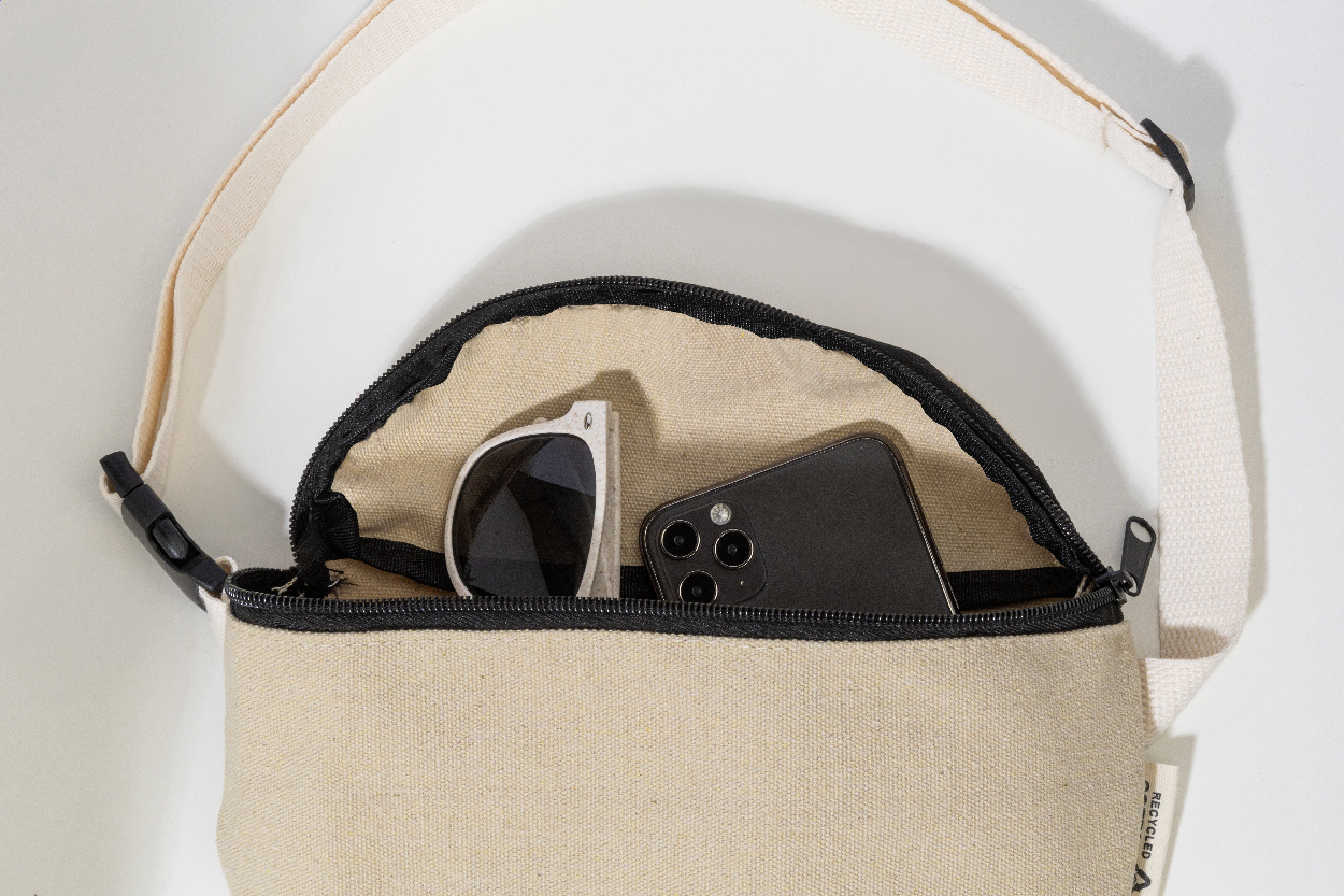 Ledvinka z recyklovaného plátna s přihrádkou na zip a nastavitelným popruhem. 70 % recyklované bavlny a 30 % recyklovaného polyesteru. S výraznou etiketou z recyklované bavlny.