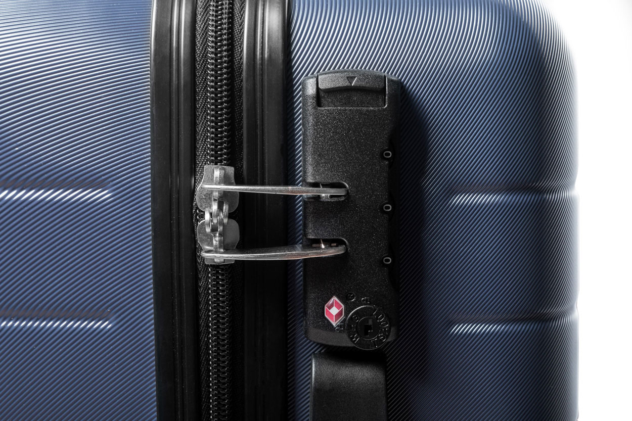 Plastový kufr RPET se 4 dvojitými kolečky, teleskopickou rukojetí a kombinovaným zámkem TSA. S vnitřní podšívkou RPET a elastickými upevňovacími popruhy. S výrazným znakem RPET.