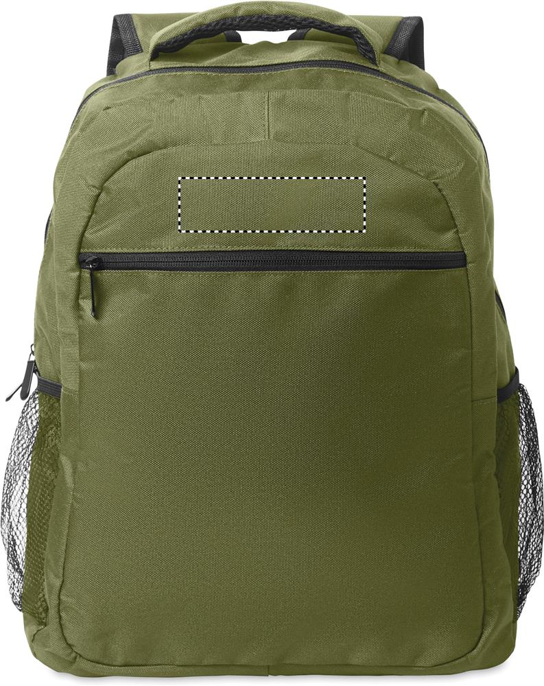 Batoh z polyesteru 600D RPET s polstrovanou přihrádkou na 15palcový notebook uvnitř, síťovanými kapsami na obou stranách a přední kapsou na zip.