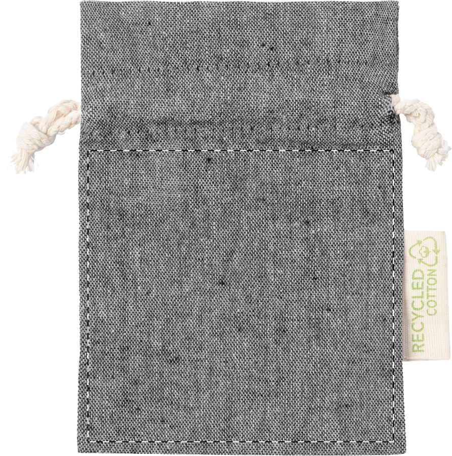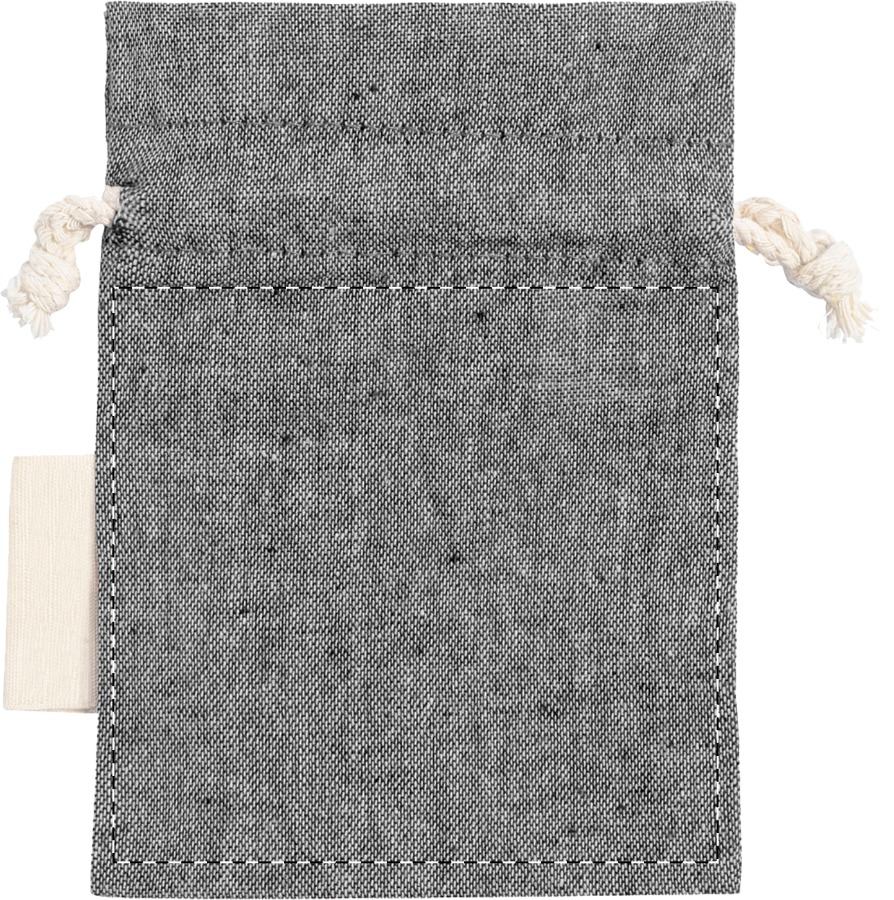 Dárkový pytlík z recyklované bavlny se stahováním na šňůrku. S výrazným štítkem z recyklované bavlny. 100% recyklovaná bavlna, 120 g/m².