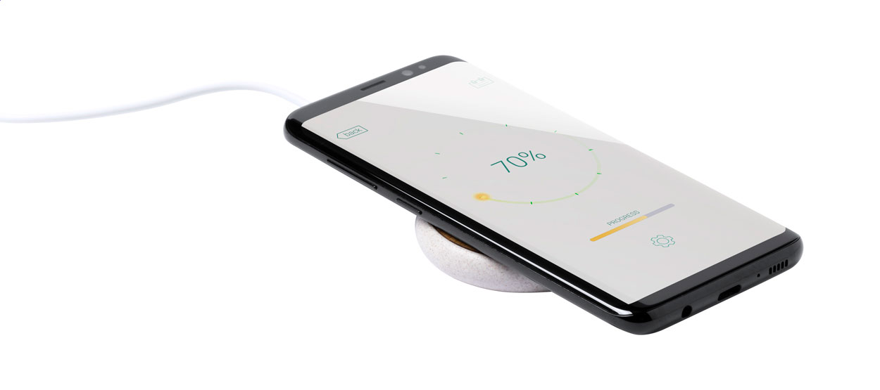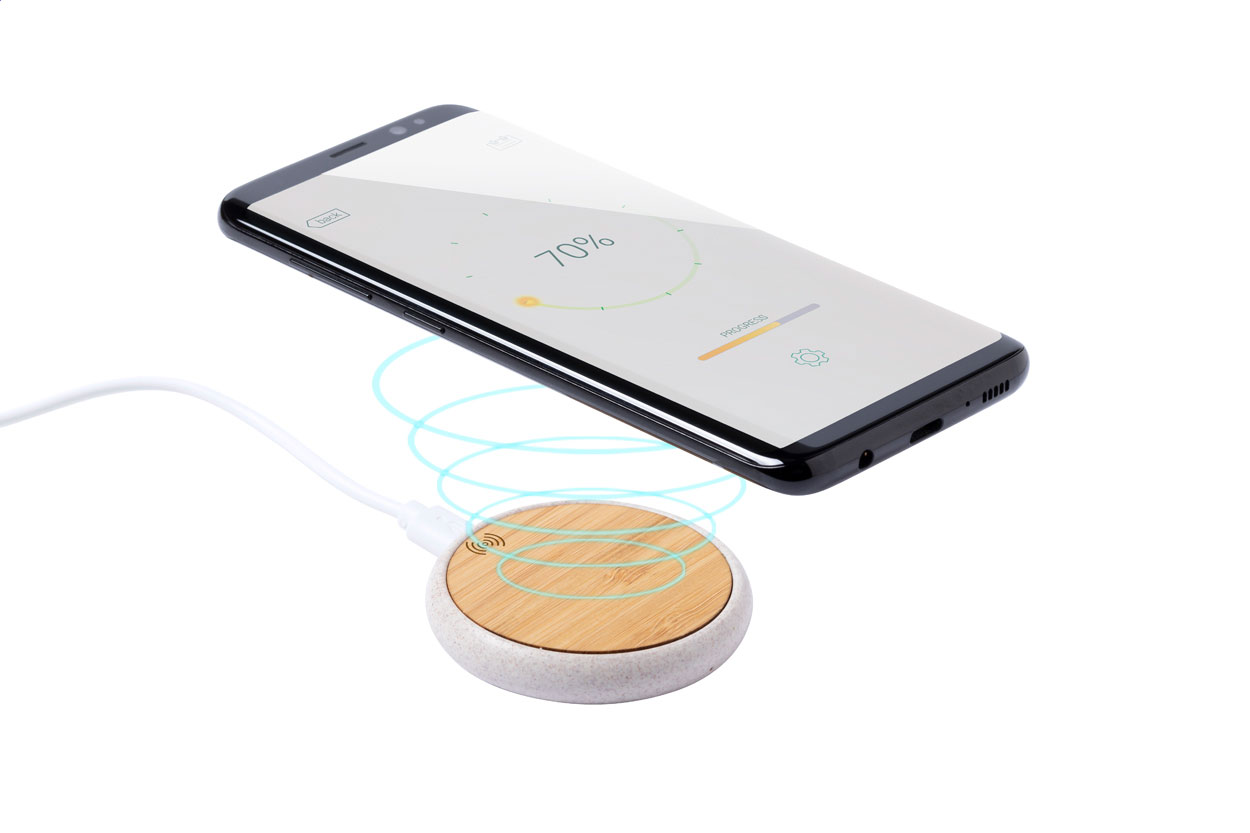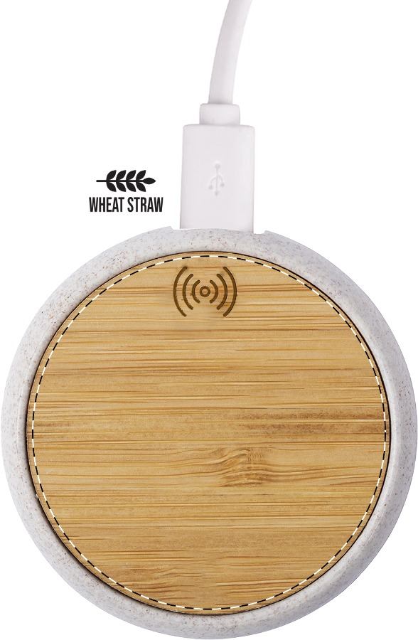 Bezdrátová nabíječka (10W) v plastovém pouzdře z bambusu a ekologické pšeničné slámy. Včetně kabelu USB.