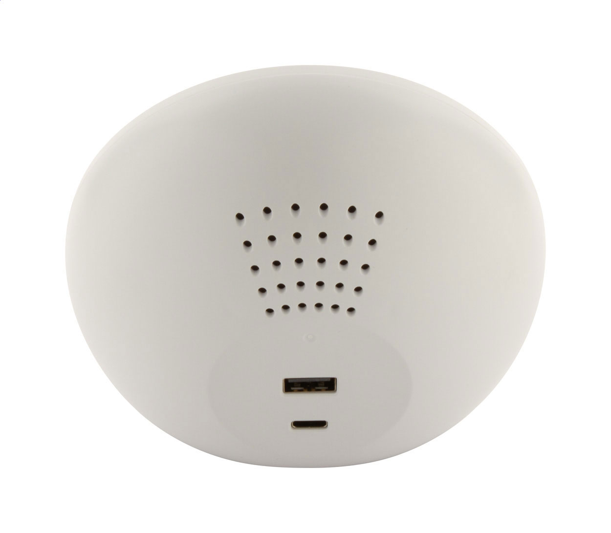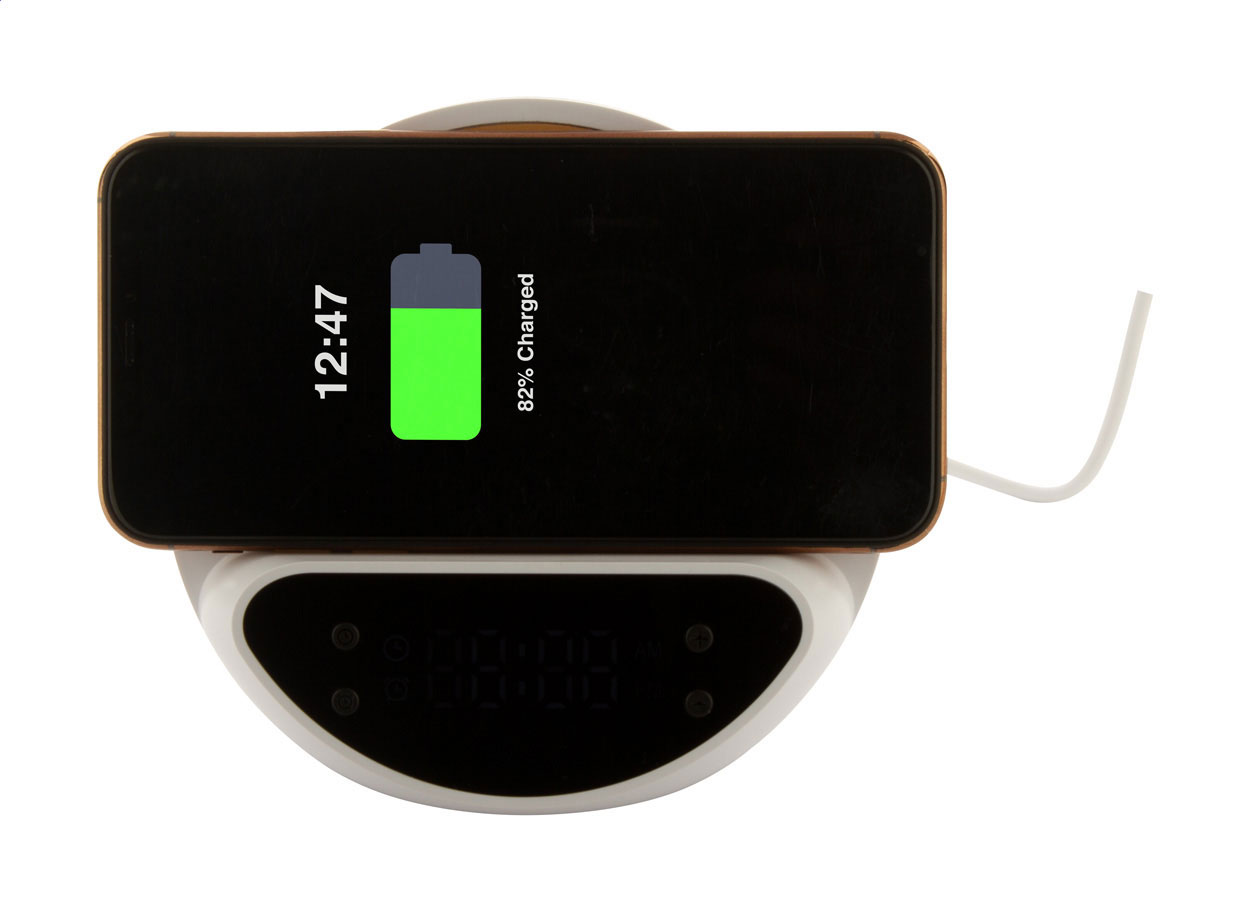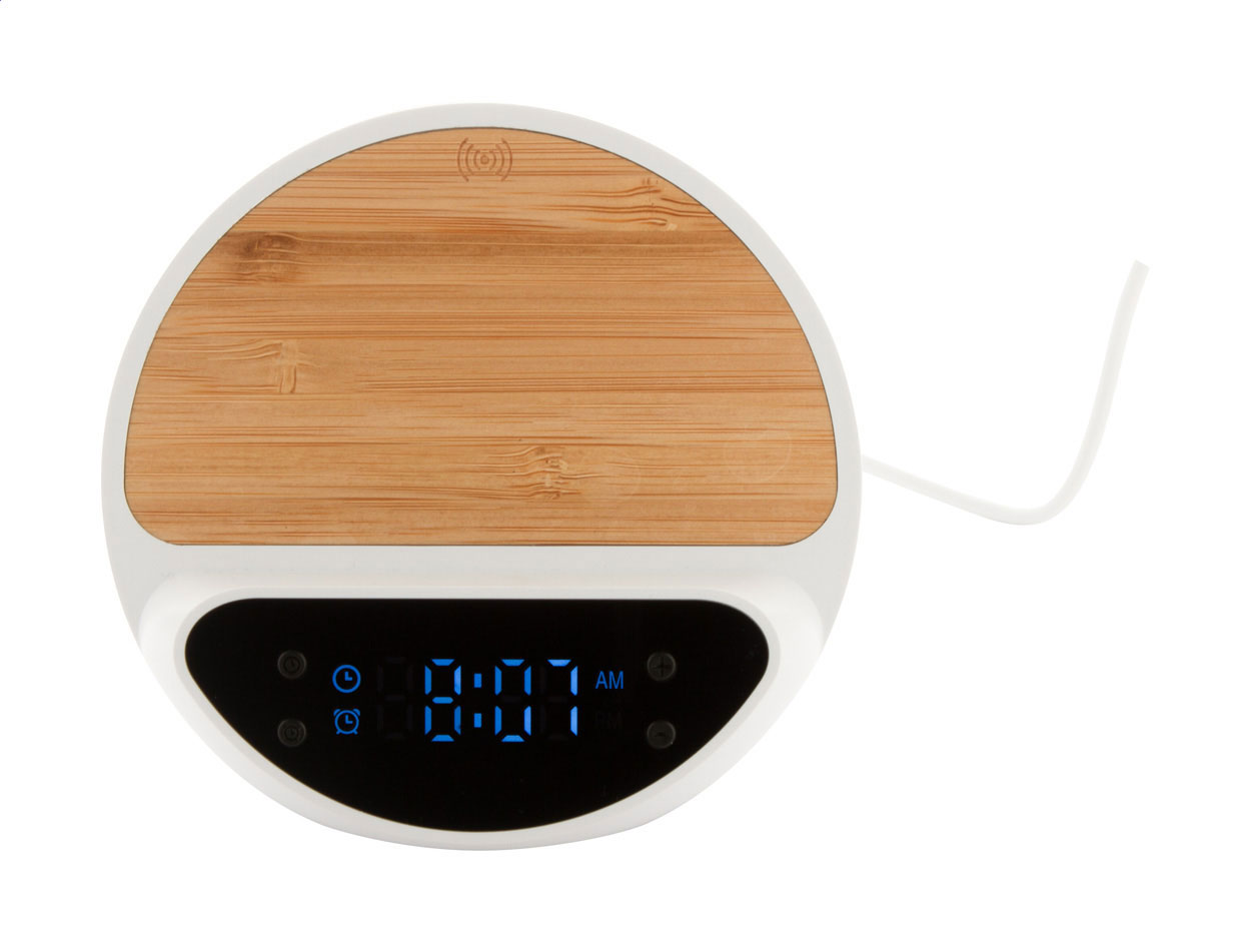 Digitální budík v pouzdře z recyklovaného ABS a bambusu, se stojánkem na mobilní telefon a vestavěnou bezdrátovou rychlonabíječkou (15W). Včetně USB nabíjecího kabelu.