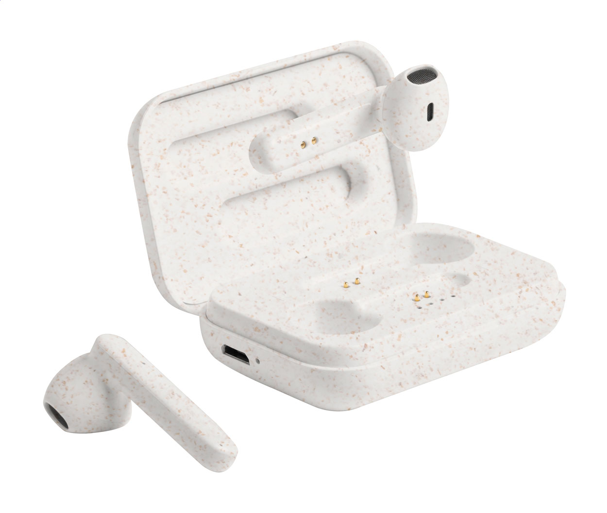 Ekologická plastová sluchátka s pšeničnou slámou, skutečně bezdrátová stereofonní sluchátka (TWS) s funkcí handsfree volání v nabíjecím pouzdře. Včetně nabíjecího kabelu USB. V kraftové papírové krabici.