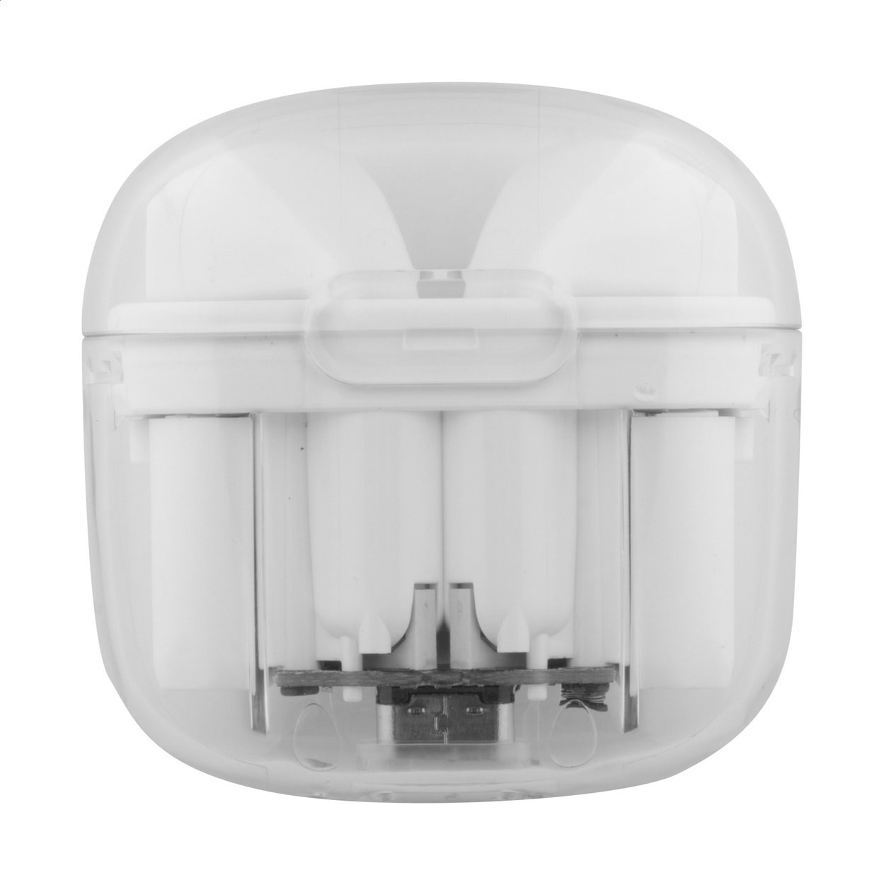 Sluchátka z recyklovaného ABS plastu s funkcí hands-free volání, v průhledném nabíjecím pouzdře. Včetně nabíjecího kabelu USB.
