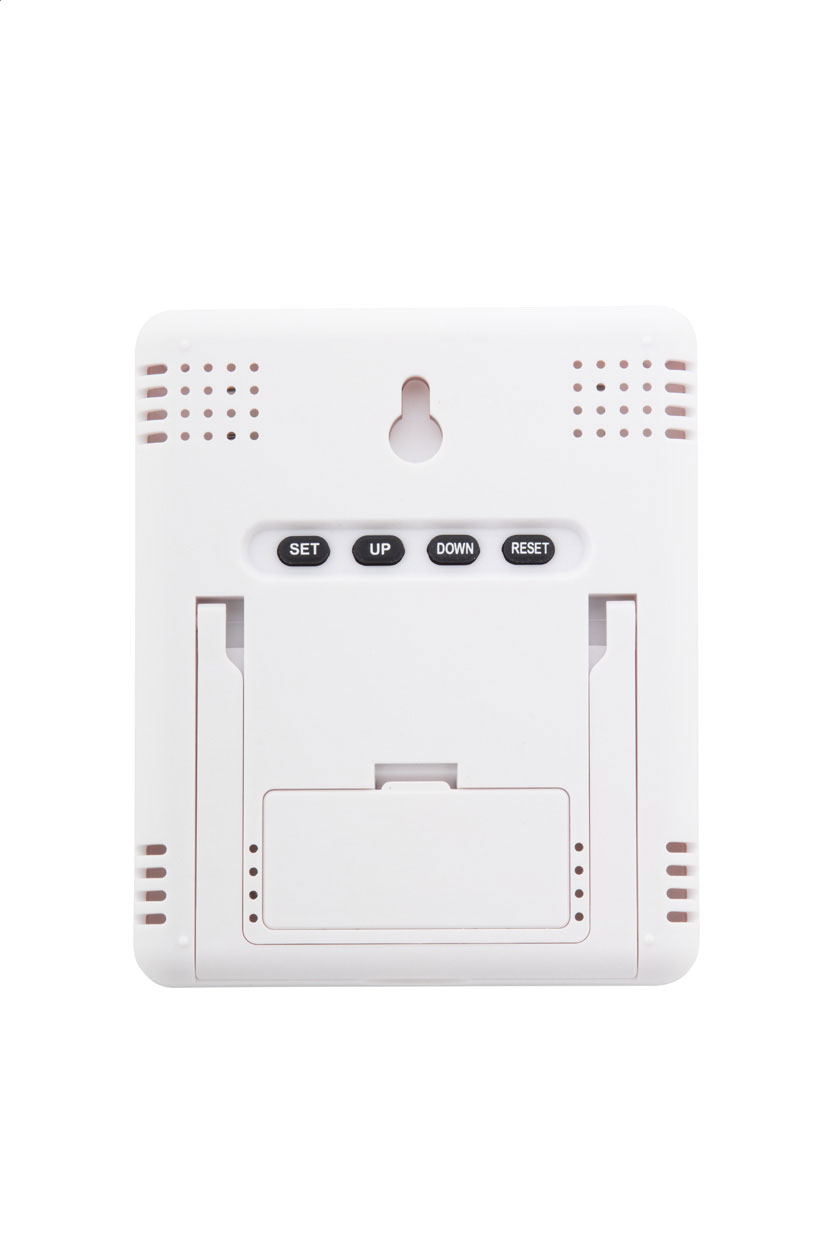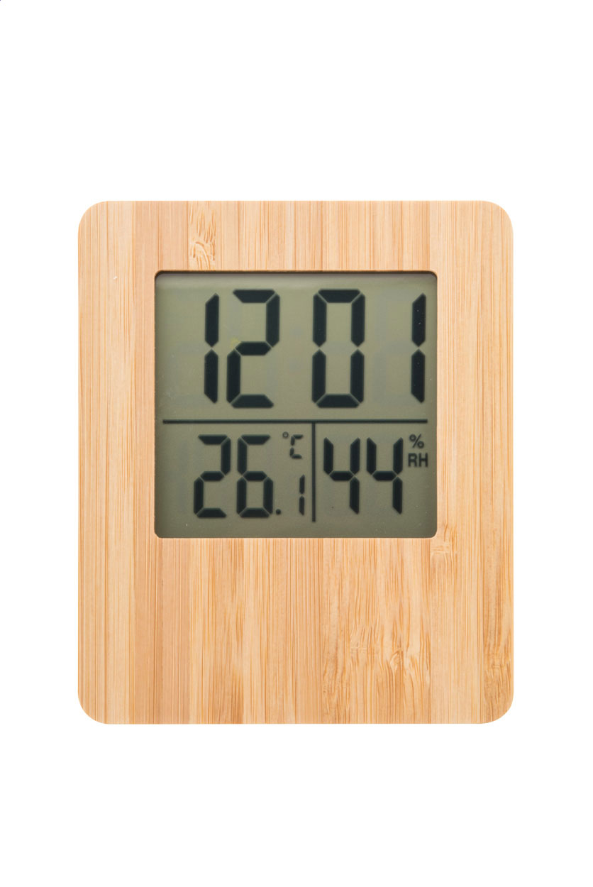 Meteostanice a digitální hodiny s bambusovým předním panelem. Funkce: budík, kalendář, teploměr a ukazatel vlhkosti. Funguje na 2 baterie AAA, bez baterie.