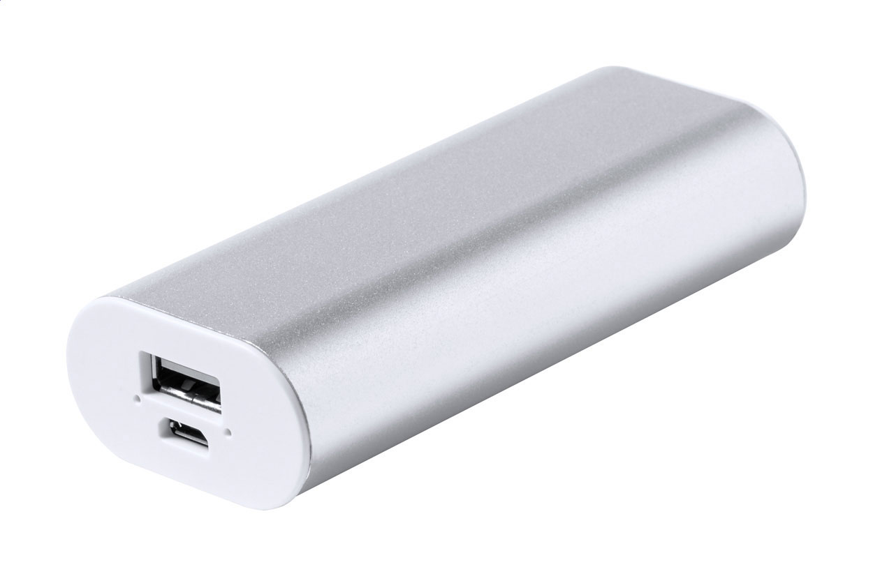 Hliníková power banka s 2200 mAh baterií. S portem USB nabíječky a vstupním portem micro USB. Včetně USB nabíjecího kabelu.