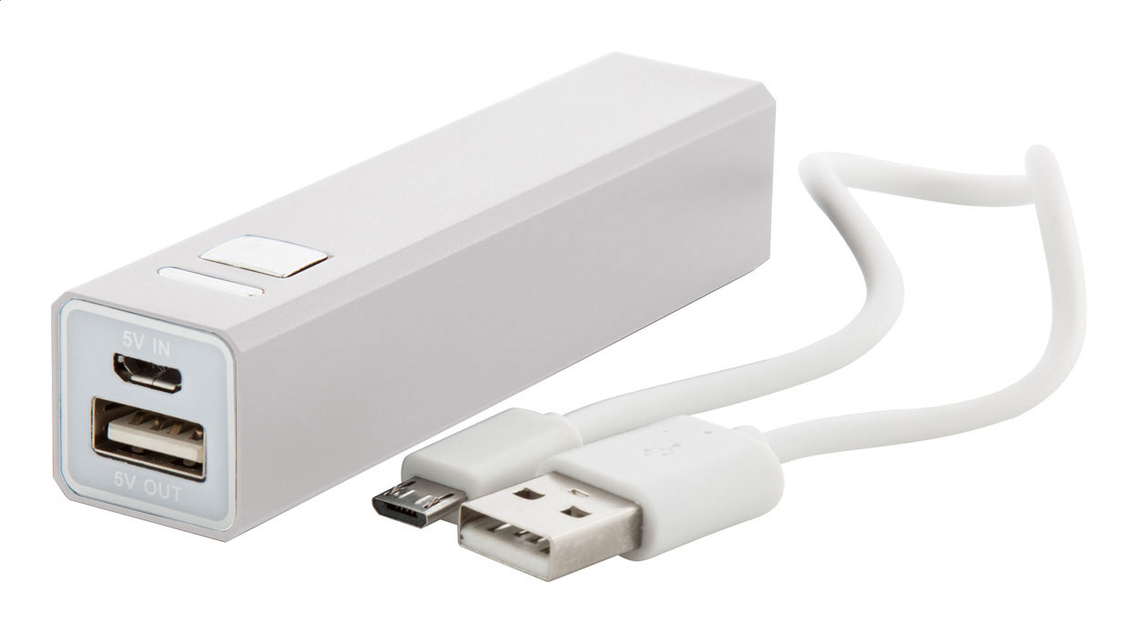 Hliníková USB power banka s 2200 mAh baterií, vč. mikro USB nabíjecího kabelu.