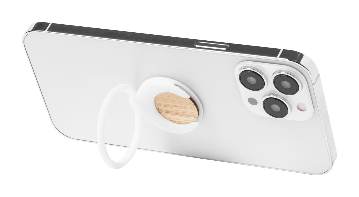 Kulatý ABS plastový držák na mobil se samolepicí spodní stranou a bambusovou mincí do nákupního vozíku.
