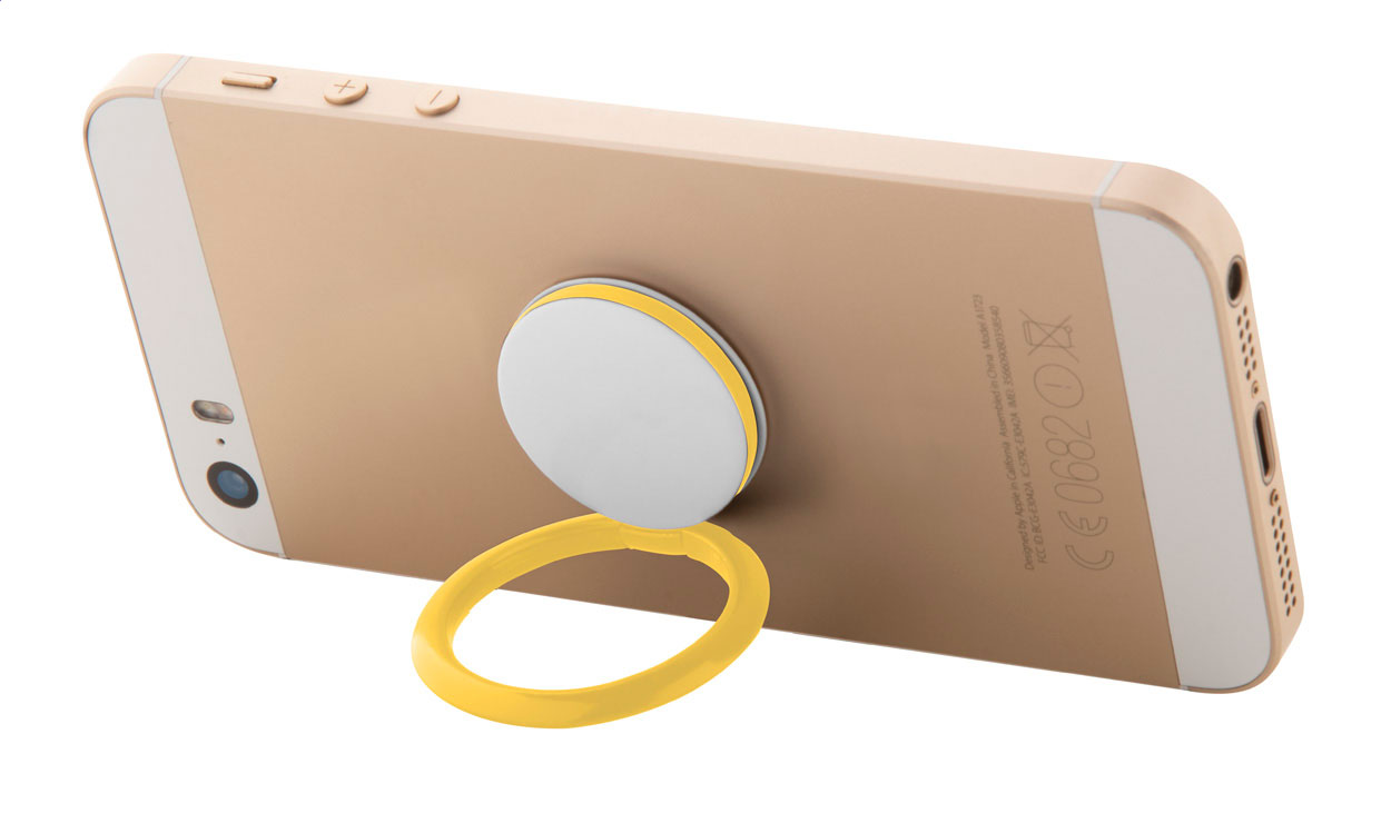 Kulatý, plastový stojánek na mobil s kroužkem na prst se samolepícím stranou.