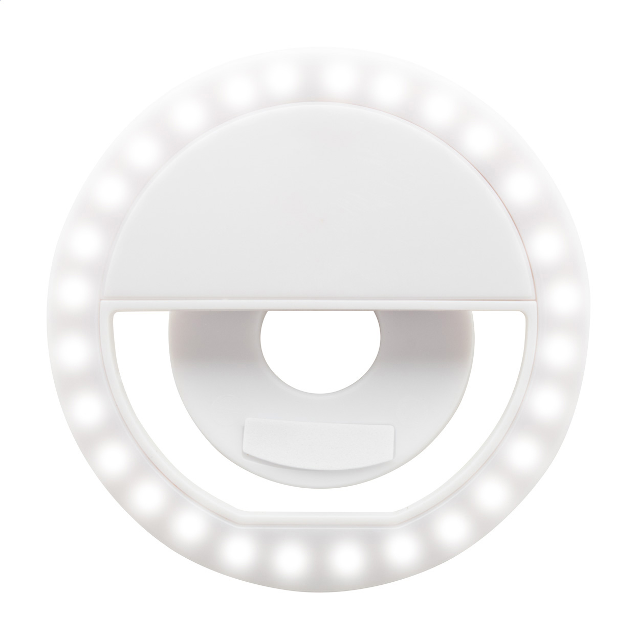 Selfie světlo z recyklovaného ABS materiálu s 28 LED diodami pro mobilní telefony. Se 3 nastavitelnými úrovněmi jasu a vestavěnou dobíjecí baterií (150 mAh). Včetně USB nabíjecího kabelu.