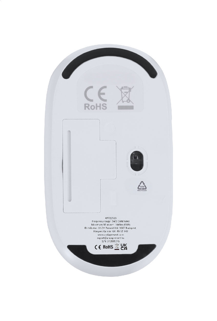 Bezdrátová optická myš v pouzdře z recyklovaného ABS plastu a recyklovaného hliníku. Funguje na 1 AA baterii, dodává se bez baterie.