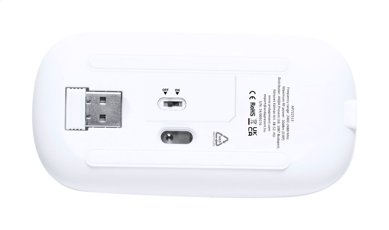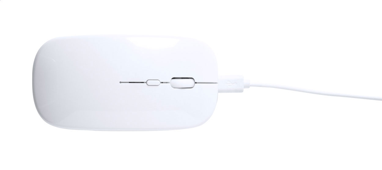 Bezdrátová optická myš s krytem z recyklovaného ABS plastu a vestavěnou dobíjecí baterií. Včetně USB nabíjecího kabelu.