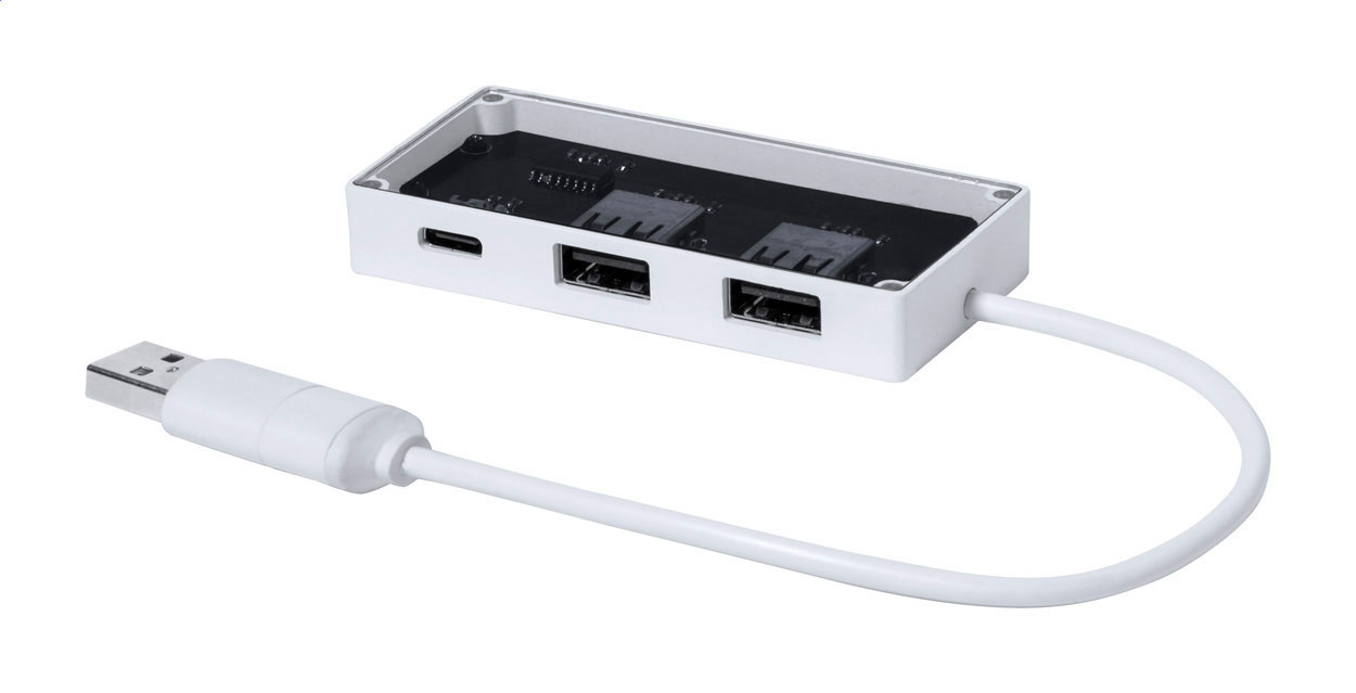 Průhledný plastový USB hub s viditelnými elektronickými součástkami, 2 USB a 1 USB-C port, USB 2.0. Včetně kabelu s připojením USB a USB-C.