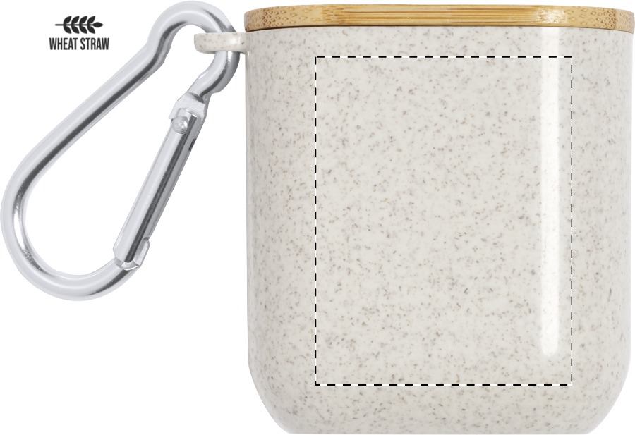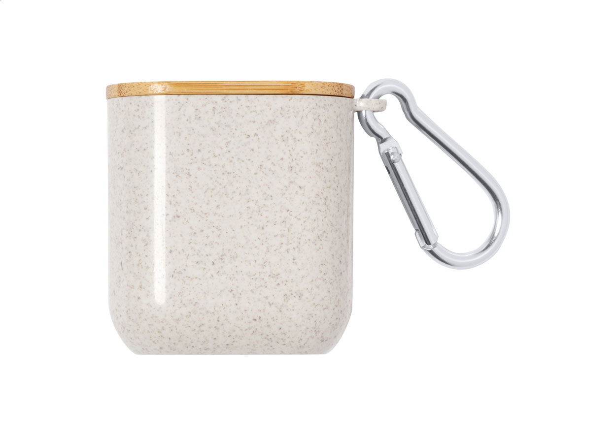 USB nabíjecí kabel v ekologickém plastovém pouzdře z pšeničné slámy s karabinou a bambusovým víkem držáku na mobil. S konektory micro USB, USB-C a Lightning. Se vstupy USB a USB-C.