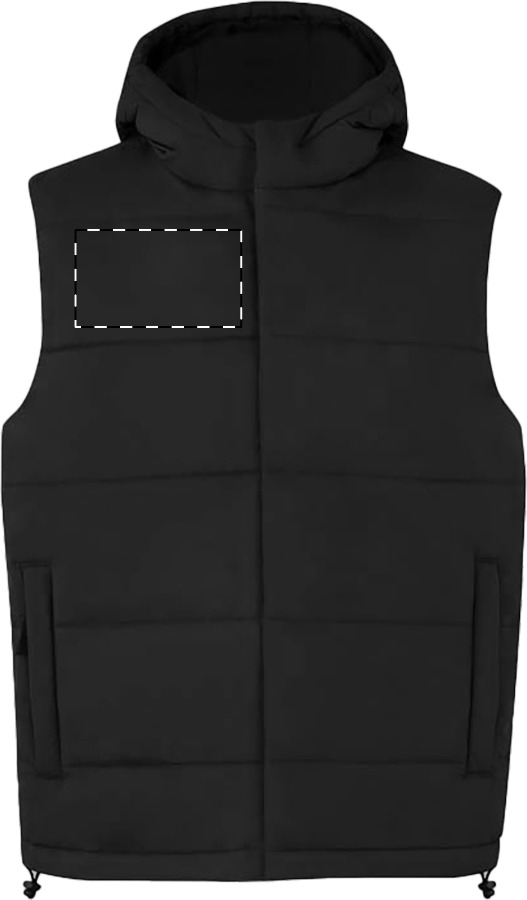 Větru a vodě odolná, vatovaná vesta s dvojitým předním zipem a knoflíkem. S kapucí a bočními kapsami. 100% polyester.