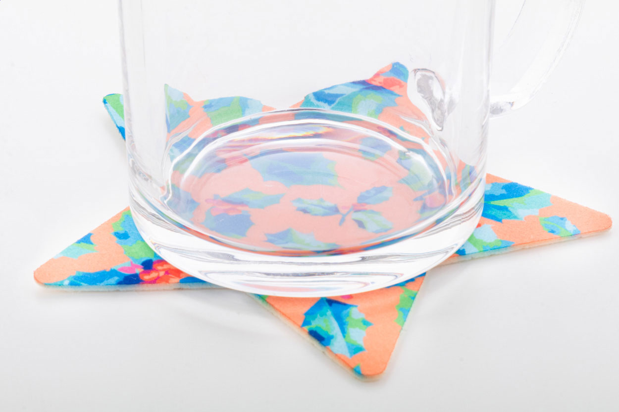 Zakázkový vánoční podtácek z plsti RPET ve tvaru hvězdy s vlastní grafikou na jedné straně. Cena včetně sublimačního tisku, nezahrnuje tiskovou přípravu. Min. mn.: 100 ks.