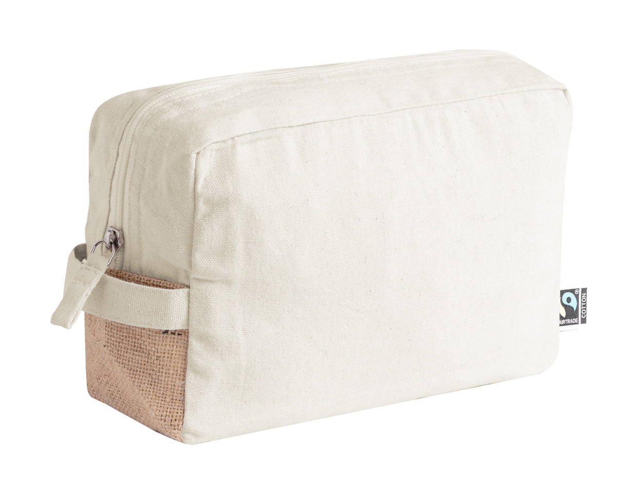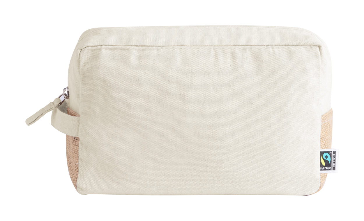 Kosmetická taštička na zip z Fairtrade bavlny a laminované juty, s výrazným Fairtrade štítkem. 100% Fairtrade bavlna, 180 g/m².
