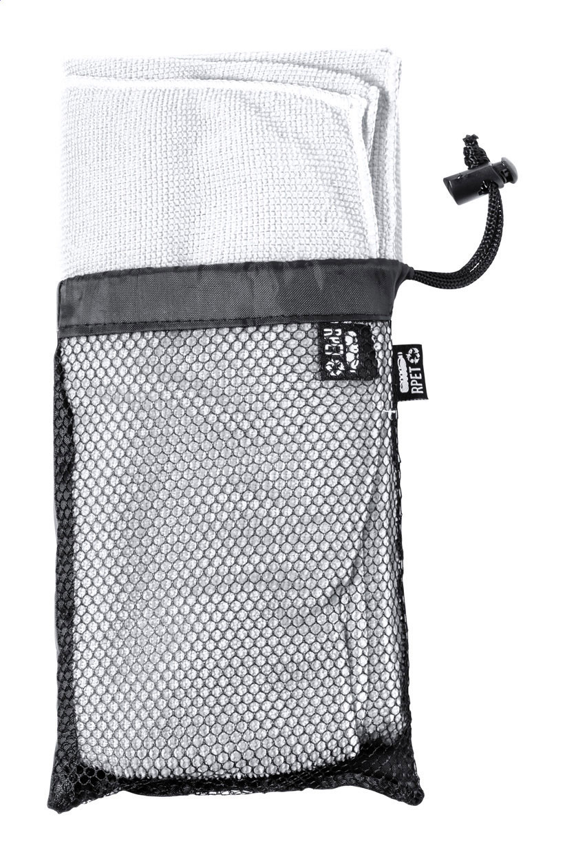 Sportovní ručník z mikrovlákna v přenosném pouzdře RPET s výrazným štítkem RPET. Polyester RPET, 160 g/m².
