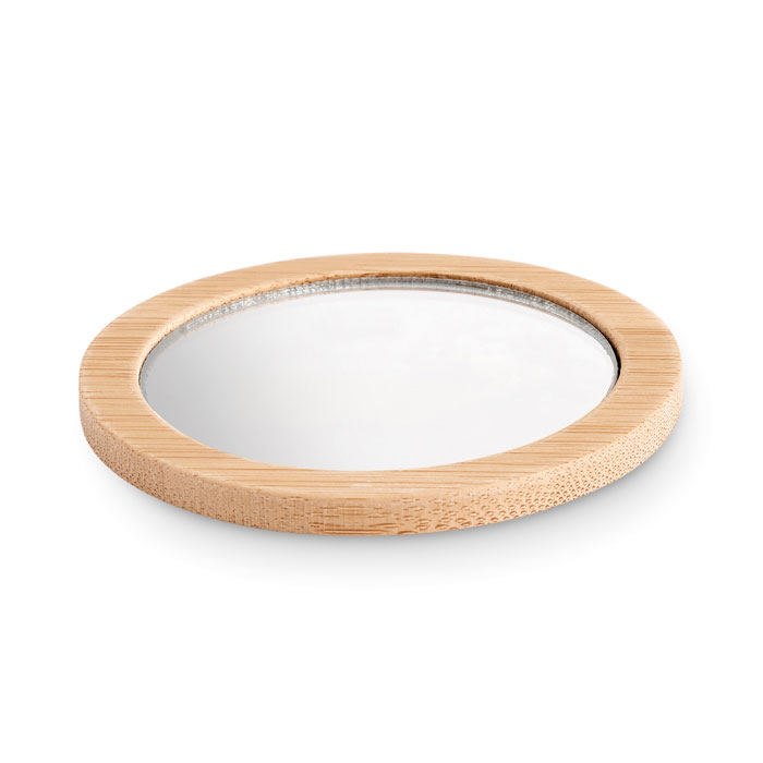 Zaoblené bambusové jednostranné kosmetické zrcátko. Toto malé zrcátko je ideální mít u sebe, abyste se mohli nalíčit nebo rychle zkontrolovat, jak vypadáte. Je uloženo v bavlněném pouzdře se stahovací šňůrkou. Bambus je přírodní materiál, u každého jednotlivého kusu se mohou vyskytnout drobné odchylky v barvě a velikosti, které mohou mít vliv na finální podobu potisku. FSC®-certified | FSC 100%, N5.7, FSC-C213206