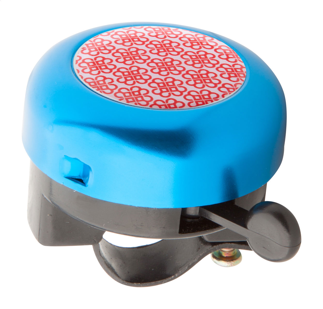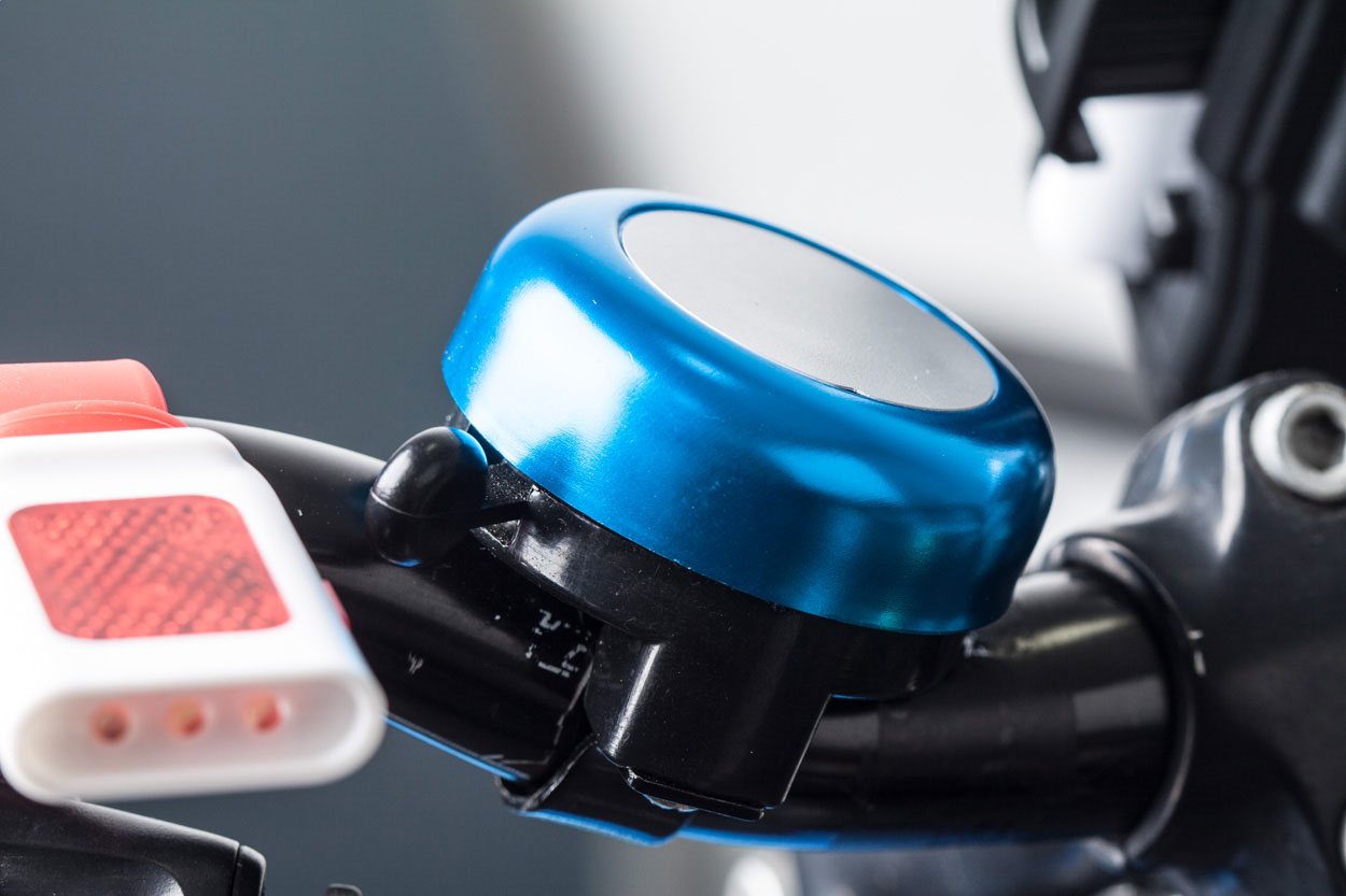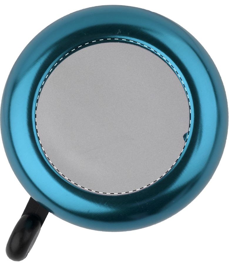 Hliníkový zvonek na kolo se stříbrnou plochou.