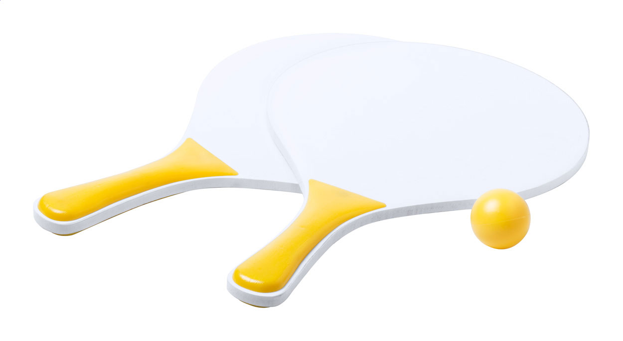 Plážový tenis se 2 velkými raketami a jedním míčkem ze dřeva a plastu.
