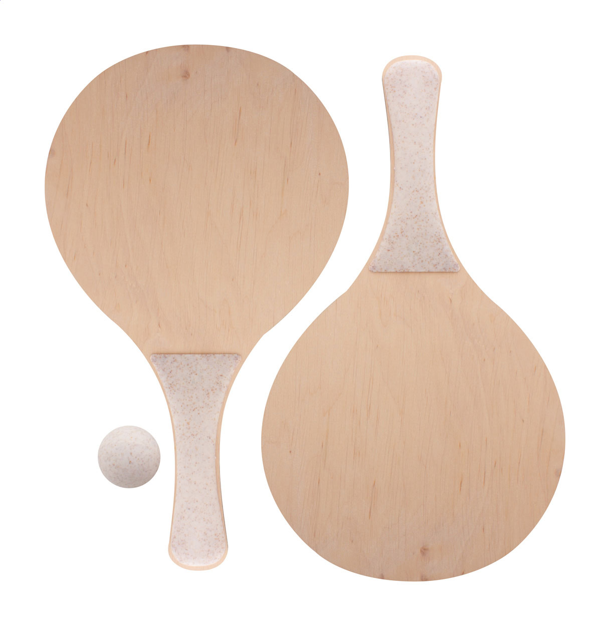 Plážový tenis na zakázku se 2 raketami a jedním míčkem. Vyrobeno z březové překližky a ekologického plastu z pšeničné slámy. Cena zahrnuje identický plnobarevný potisk na přední straně obou raket, nezahrnuje tiskovou přípravu. Min. mn.: 50 ks.