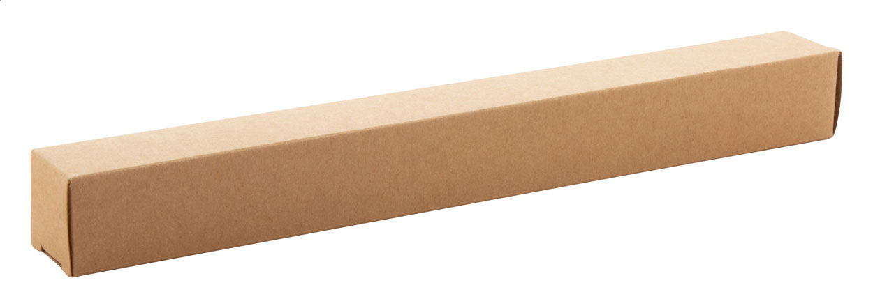 Vějíř z RPET lahví a dřevěnými žebry, v kraftové papírové krabičce.
