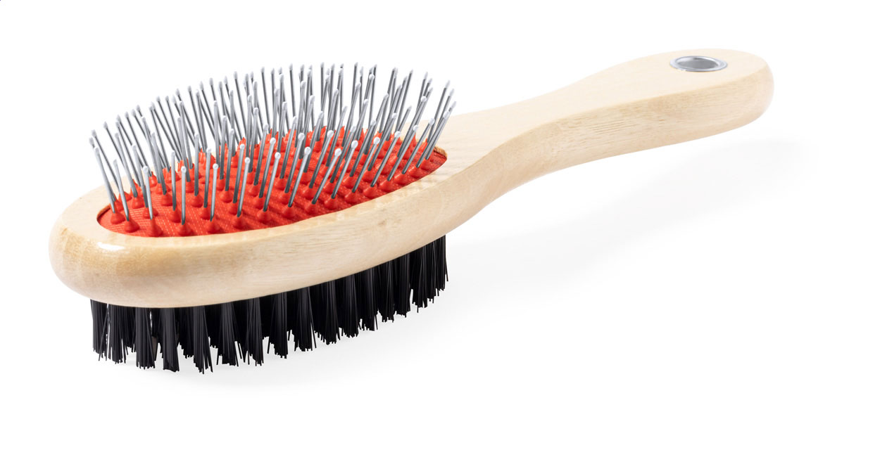 Oboustranný kartáč na zvířata s dřevěnou rukojetí.