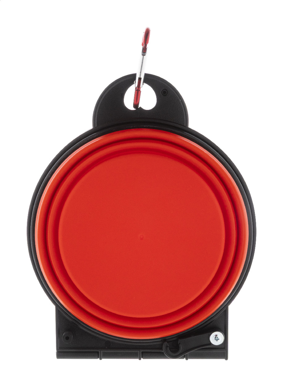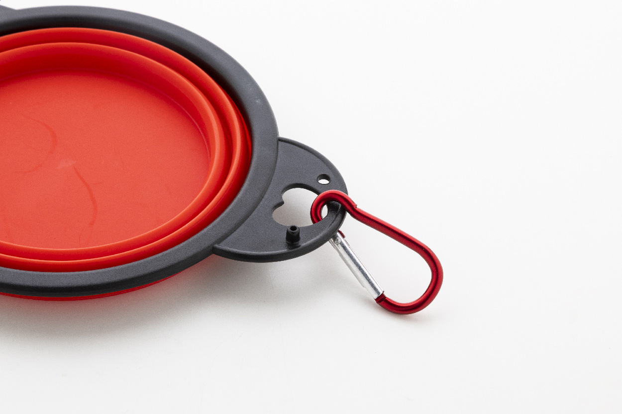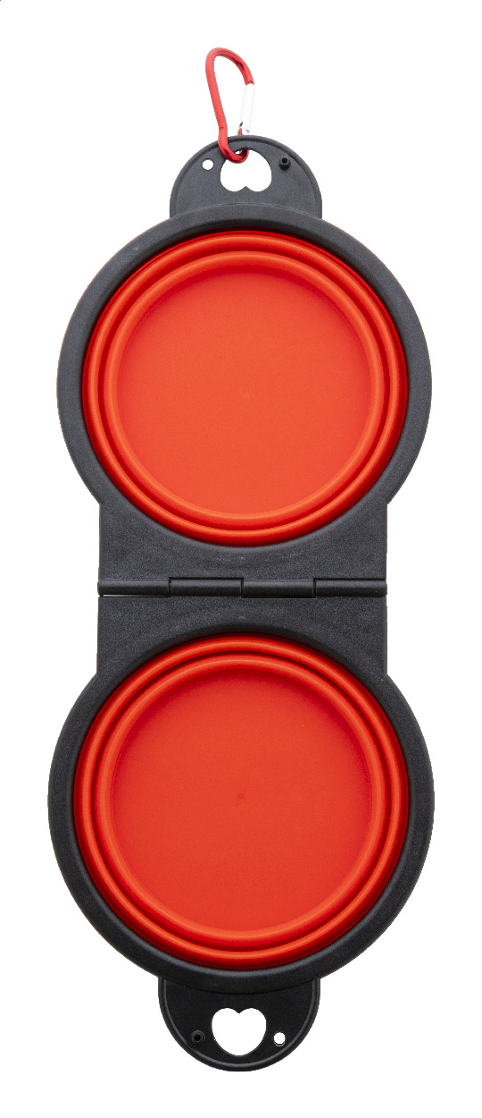 Skládací miska pro domácí mazlíčky z odolného TPE se dvěma přihrádkami o objemu 450 ml a barevně sladěnou hliníkovou karabinou.