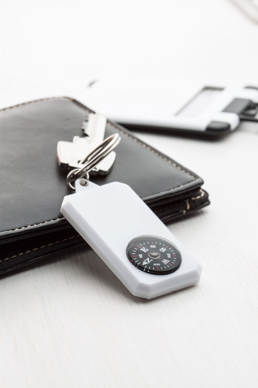 Plastová klíčenka s kompasem a kovovým kroužkem.