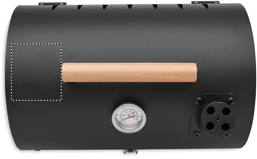Přenosný grilovácí sud ze železa s komínkem a ukazatelem teploty. Černý práškový nástřik. Dřevěné držadlo na přenášení